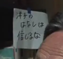 (父亲背后的字条:“不要相信洋子的话”)