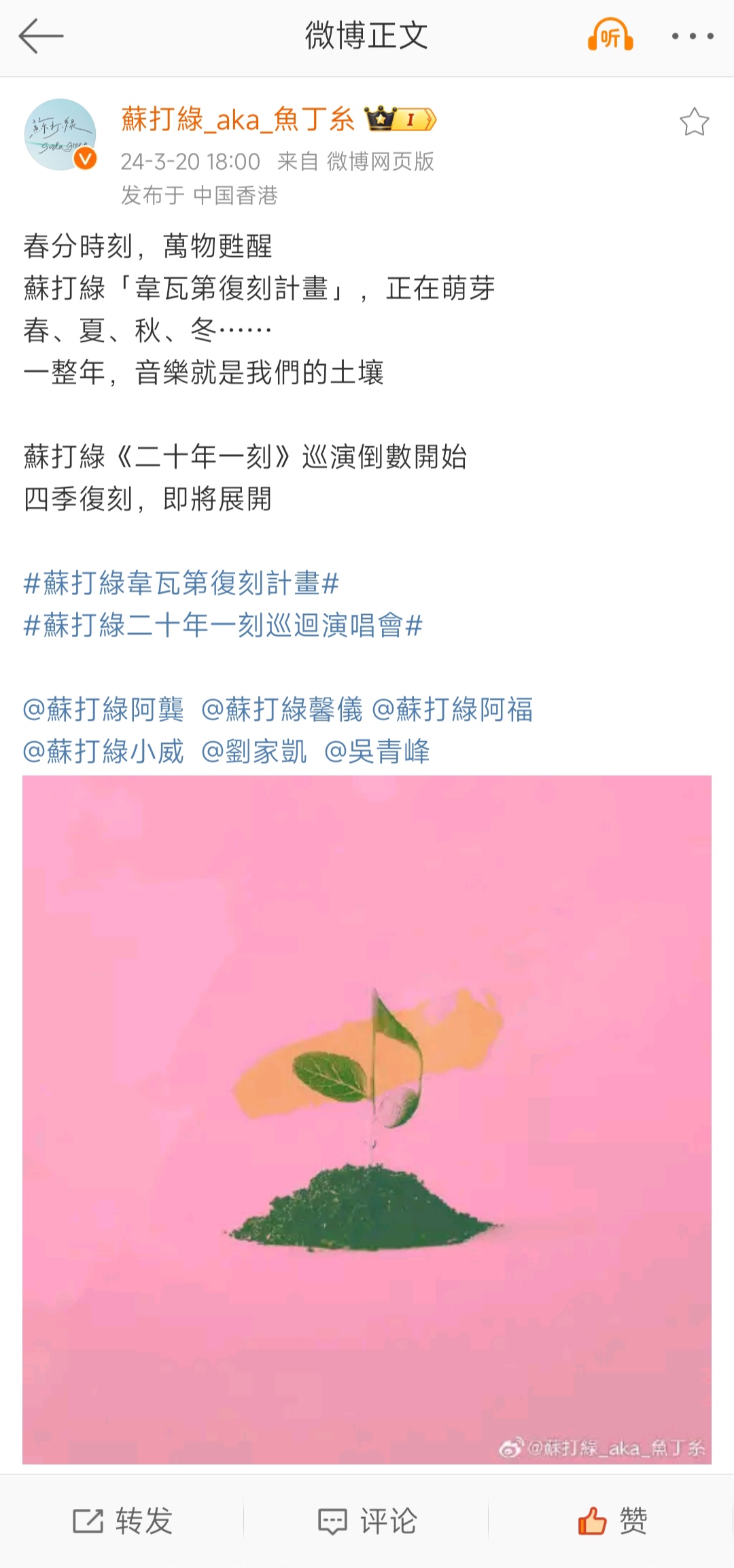 昨天(3月20日)春分之际,苏打绿官方社媒发文,宣告了在巡演的同时关于专辑复刻计划也继续在进行着,众多打粉老师期待的维瓦第计划四季专辑的复刻苏打绿版即将与大家见面,巡演的倒数也是四季专辑复刻的倒数,真是太让人开心啦!