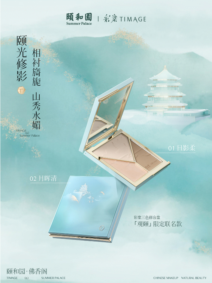 案例概述:彩棠作为国货彩妆品牌,在2024年3月与颐和园联名推出“观颐”系列。该系列将颐和园中的山水建筑、园林布局等元素巧妙地融入到彩妆设计中,唤醒了中国人的独特审美文化。