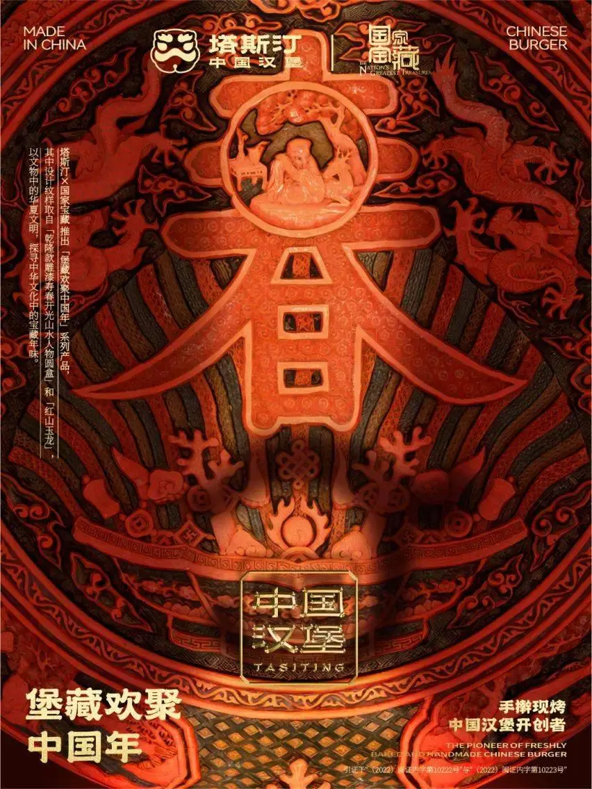 案例概述:塔斯汀中国汉堡在2024年龙年春节期间,联手国家宝藏推出以“堡藏欢聚中国年”为主题的系列产品。其中,“万狮兴龙·聚堡盆”新春限定产品融合了多款塔斯汀热门单品,设计灵感源自“乾隆款雕漆寿春开光山水人物圆盒”,为消费者送上龙年祝福。