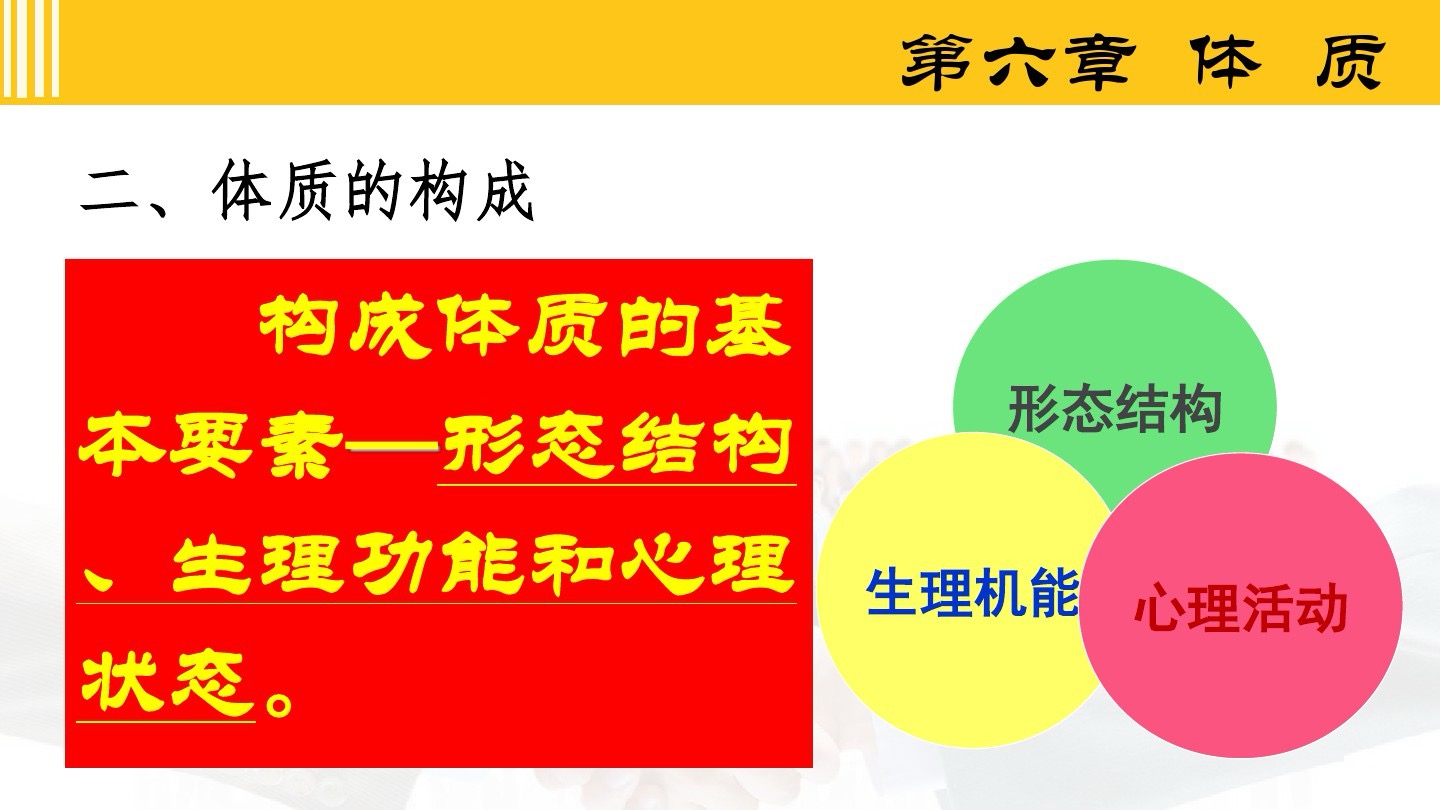(3)偏阴质是指具有抑制、偏寒、多静特点的体质类型。其特征为:形体适中或偏胖,易于疲劳;面色偏白少华:食量较小,消化力弱;平时畏寒喜热,或体温偏低;唇舌偏淡,脉多迟缓:性格内向,喜静少动,或胆小易惊;精力偏弱,动作迟缓,反应较慢,性欲偏弱。