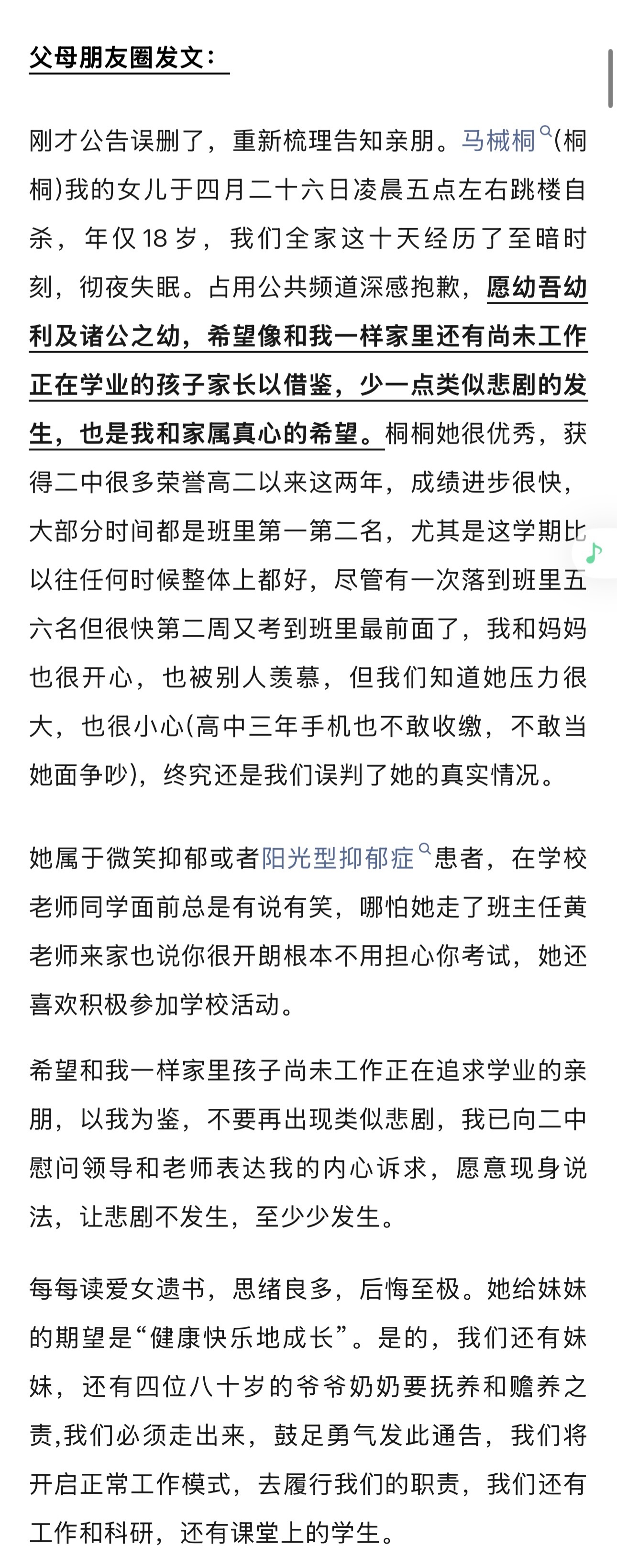 5月30日看到了一个让人很难过的新闻,一位高二女生选择用跳楼结束自己的生命。在生命的最后,给世界留一下了一份信