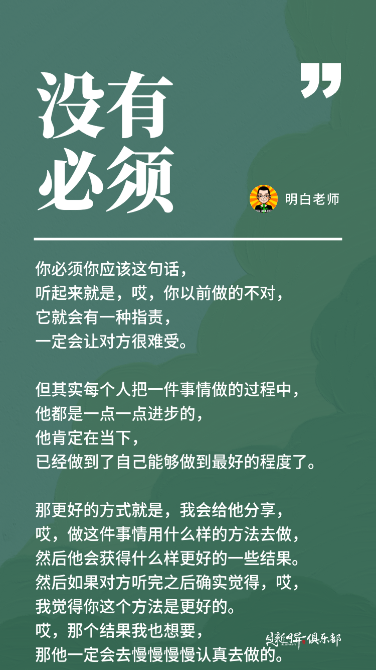 但是你必须你应该这句话,听起来就是,哎,你以前做的不对,它就会有一种指责,一定会让对方很难受。但其实每个人把一件事情做的过程中,他都是一点一点进步的,他肯定在当下,已经做到了自己能够做到最好的程度了。