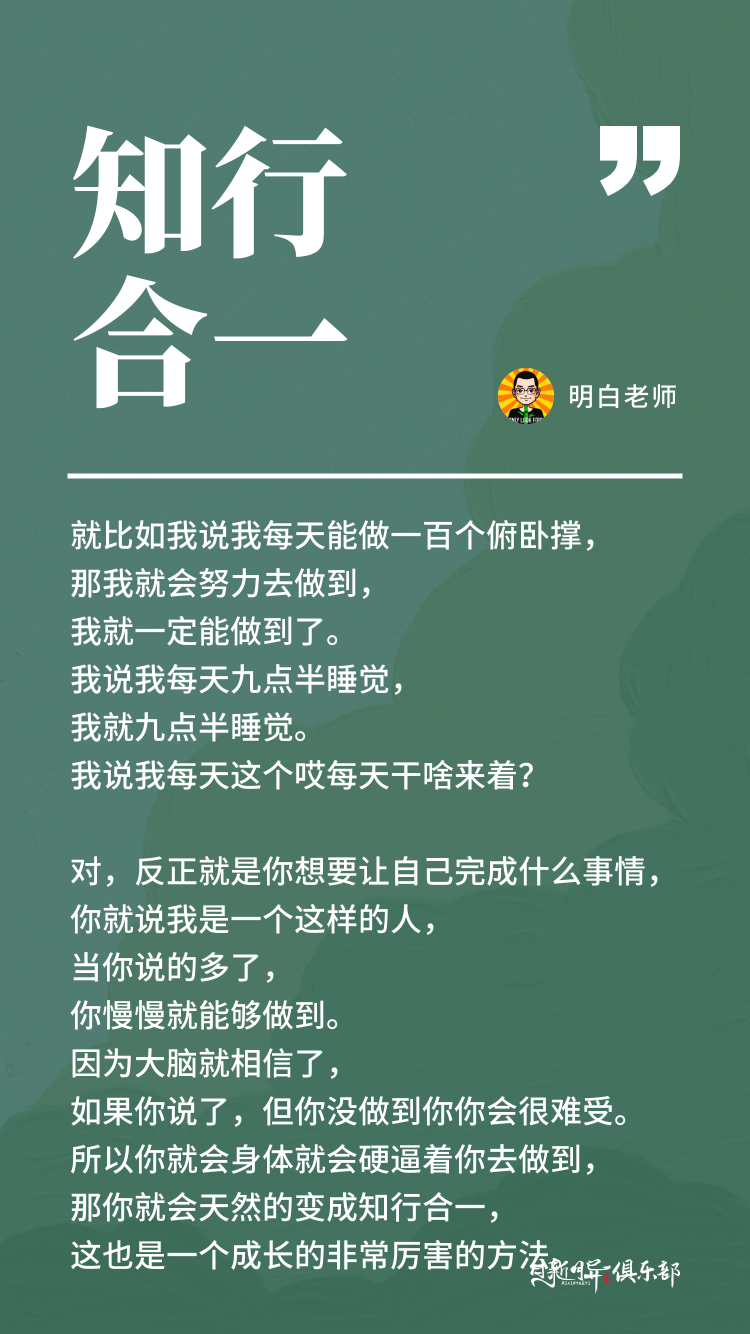因为大脑就相信了,大脑就不得不愿意。如果你说了,但你没做到你你会很难受,所以你就会身体就会硬逼着你去做到,那你就会天然的变成知行合一,这也是一个成长的非常厉害的方法。