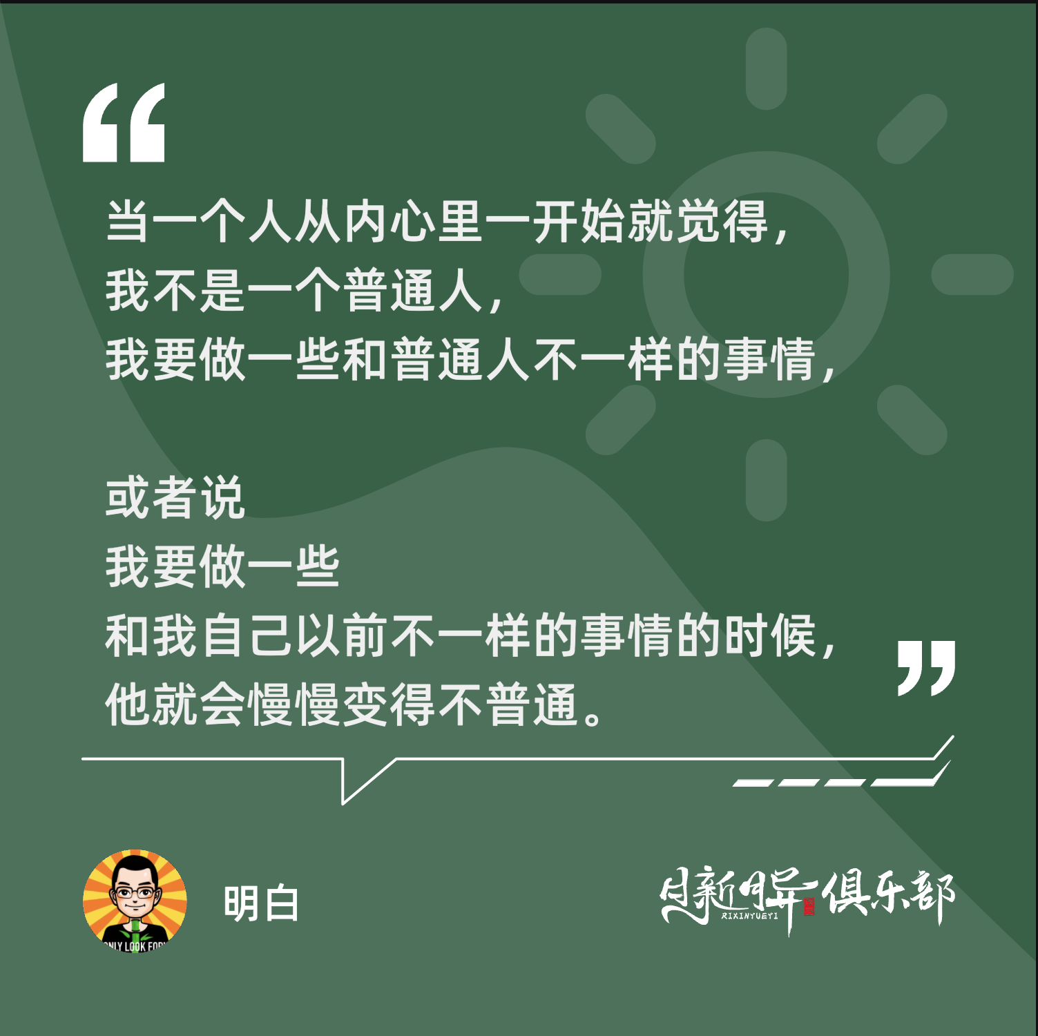 我觉得这是一挺值得思考的问题,当一个人从内心里一开始就觉得,我不是一个普通人,我要做一些和普通人不一样的事情,或者说我要做一些和我自己以前不一样的事情的时候,他就会慢慢变得不普通。