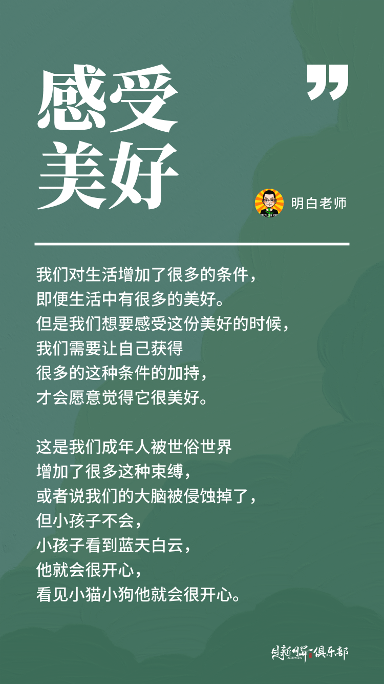 但是我们想要感受这份美好的时候,我们需要让自己获得很多的这种条件的加持,才会愿意觉得它很美好。这是我们成年人被世俗世界增加了很多这种束缚,或者说我们的大脑被侵蚀掉了,但小孩子不会,小孩子看到蓝天白云,他就会很开心,看见小猫小狗他就会很开心。