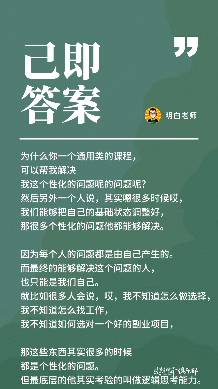 为什么你一个通用类的课程,可以帮我解决我这个性化的问题呢?然后另外一个人说,其实嗯很多时候哎,我们能够把自己的基础状态调整好,那很多个性化的问题他都能够解决。