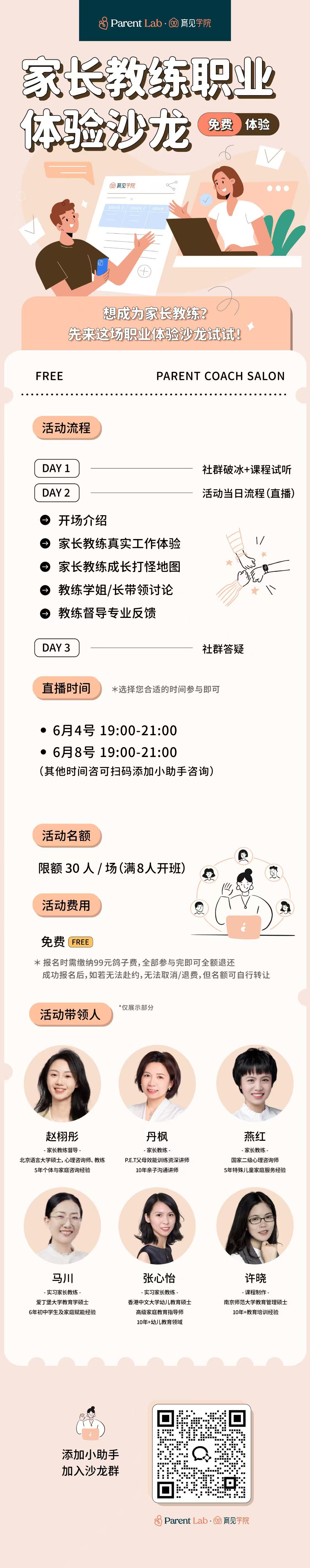 家长教练职业体验沙龙将通过:真实案例观摩、教练对话演示、互动提问与讨论带你亲身体验一次家长教练的咨询过程,了解这个职业是如何工作的,以及它能带来怎样的改变。