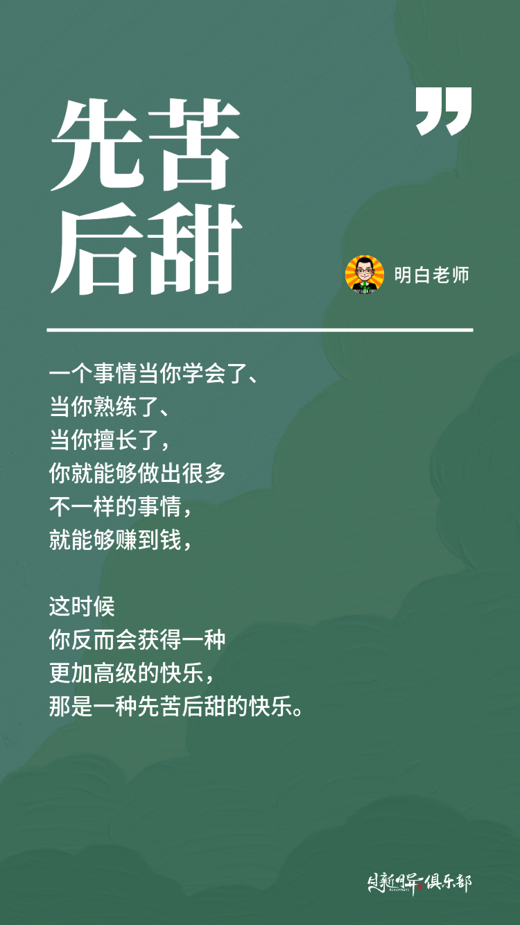 所以不要思考适不适合,而去思考是否必要,它会让你的人生不会那么拧巴,不会那么纠结,反而是会让你的变得更顺利。因为一个事情当你学会了、当你熟练了、当你擅长了,你就能够做出很多的不一样的事情,就能够赚到钱,这时候其实你就反而会获得一种更加高级的快乐,那是一种先苦后甜的快乐。