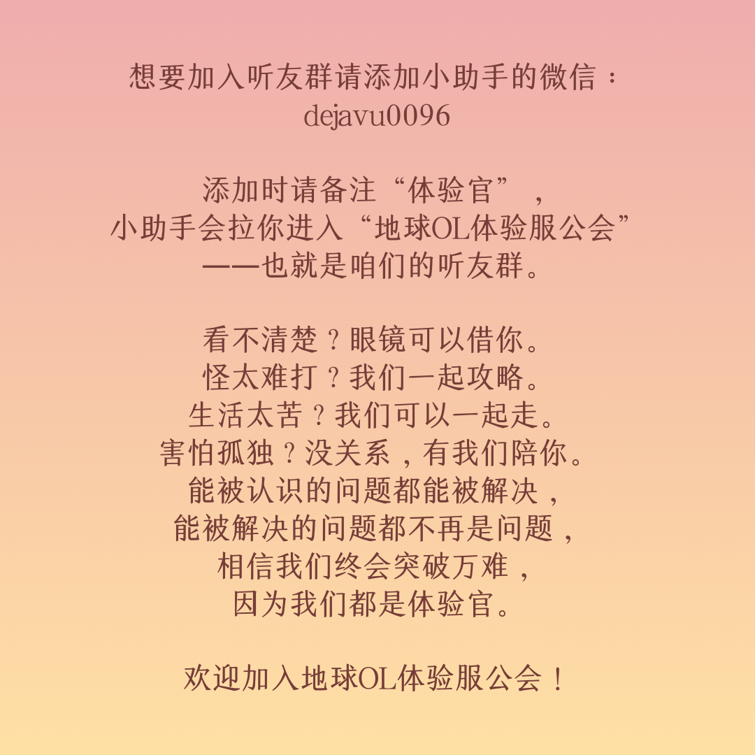 地球OL体验服,是针对地球这个开放世界的各种关卡和剧情打造的一档公会式节目。我们会在这里不定期分享地球OL攻略、奇遇体验以及聊天沙龙。在这个一生一次的游戏里,每个人都是独一无二的体验官。