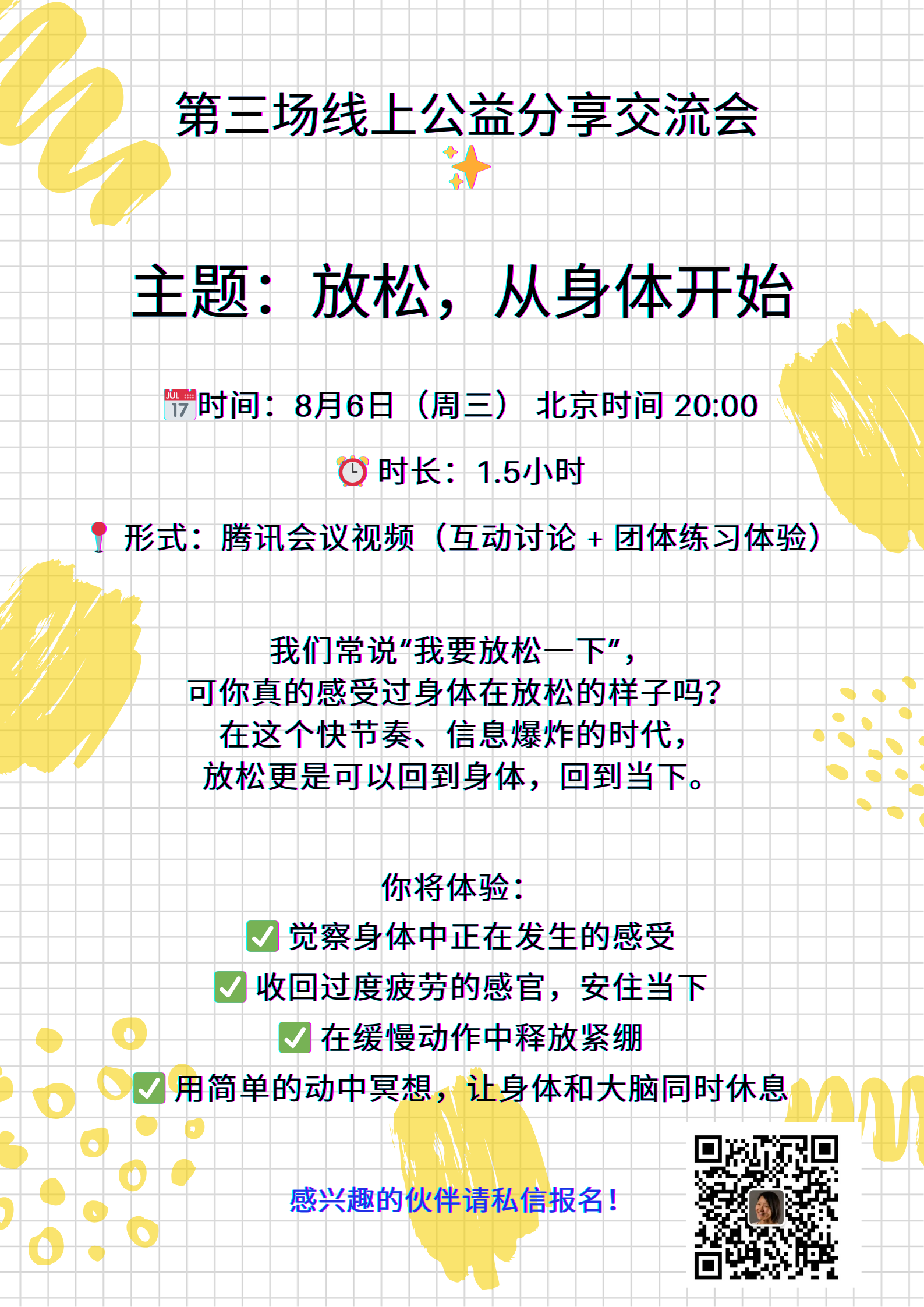 连续几期我们都聊到和身体有关的话题,我想在下个星期用一场公益分享交流会来深入让大家体验和身体的链接,找到身体的放松,欢迎朋友们参加!