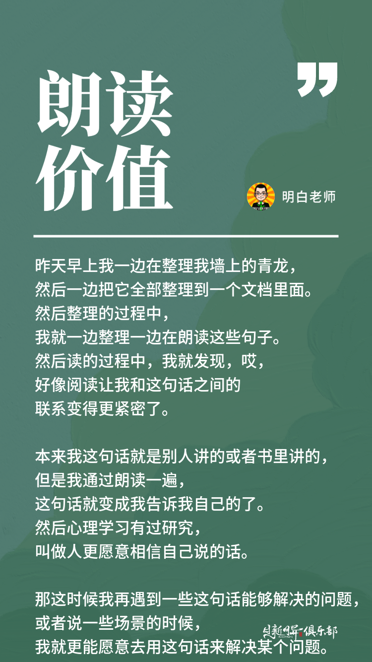 这就是朗读,能够让我更加深刻地把一个思维,把一个价值观,把一个这种道理能够更深刻地印在自己的身体里,它和这种单纯的看是两个不同维度的刺激。