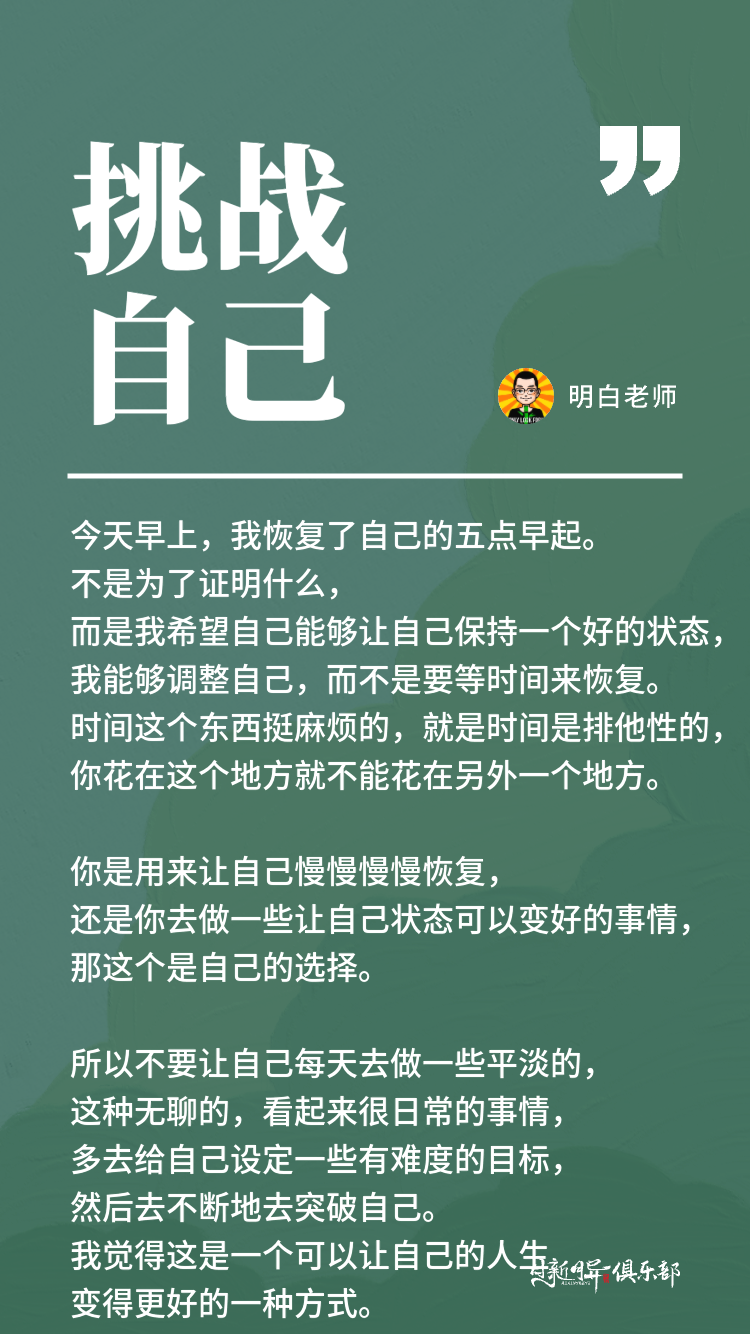 所以我今天早上,我就恢复了自己的五点早起。不是为了证明什么,而是我希望自己能够让自己保持一个好的状态,我能够调整自己,而不是要等时间来恢复。时间这个东西挺麻烦的,就是时间是排他性的,你花在这个地方就不能花在另外一个地方。
