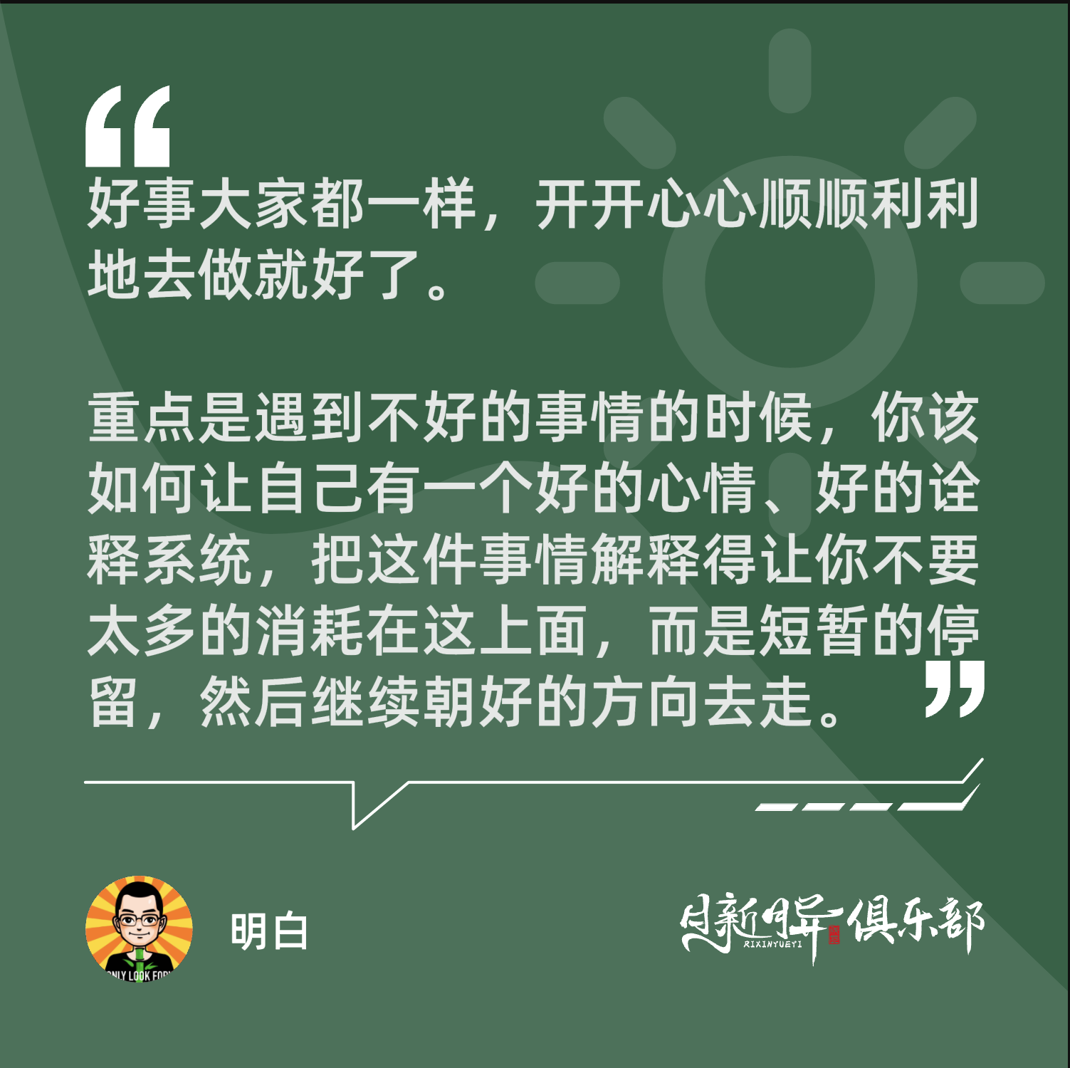重点是遇到不好的事情的时候,你该如何让自己有一个好的心情、好的诠释系统,把这件事情解释得让你不要太多的消耗在这上面,而是短暂的停留,然后继续朝好的方向去走。