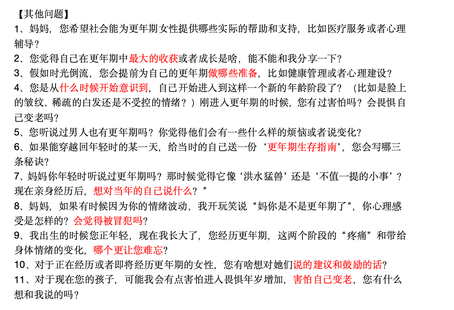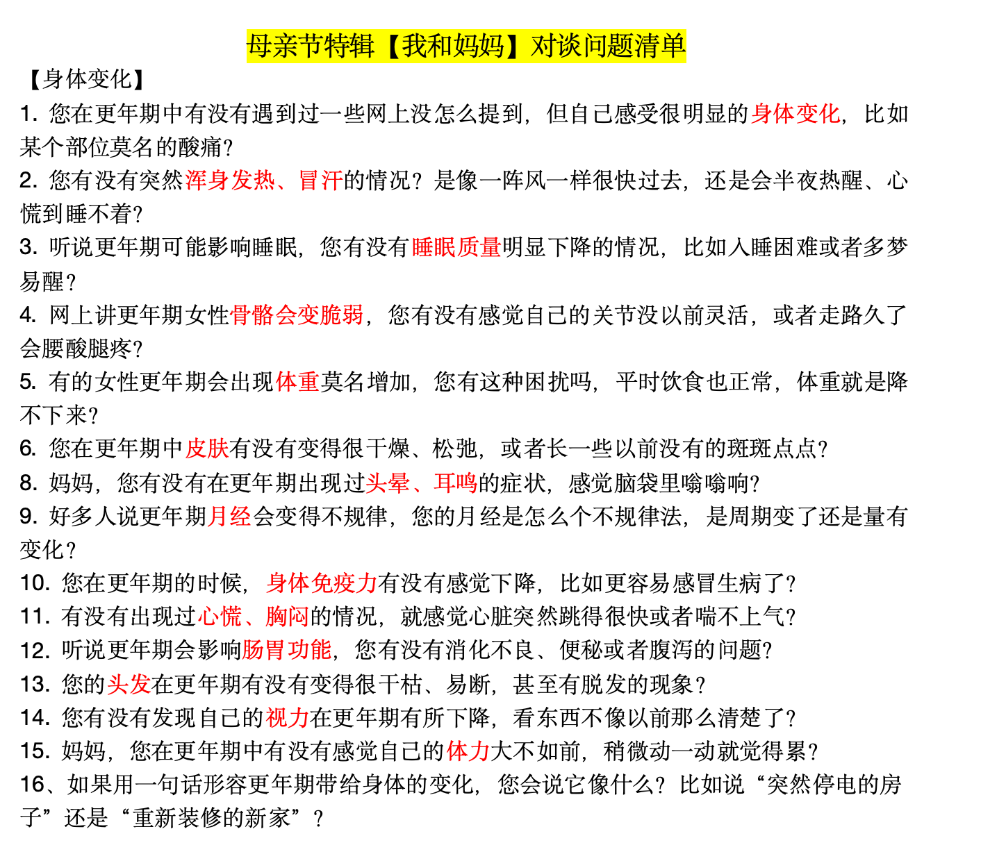 这次母亲节,糯糯和阿孔决定发起一次“「我和妈妈」的母亲节对谈”活动(ps:《对谈问题清单》附在文末)。我们希望了解更年期的妈妈在身体、情绪、社会关系上都在经历哪些变化,而这些变化问题,妈妈们都不曾主动和我们倾诉,我想作为子女,更好地了解自己的父母,也是更亲密陪伴他们的一种方式。