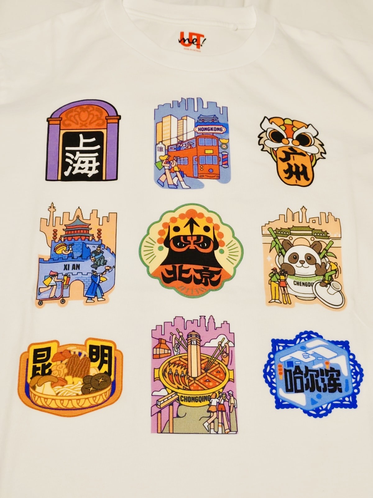 从T恤上的花式图标中,可以看出Amy曾到过9座中国的城市——除了北上广,还有重庆、成都、香港、昆明、哈尔滨等等……其中有3个Sissi都还没去过!