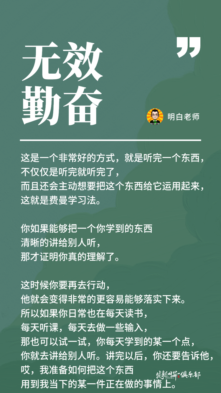 这时候你要再去行动,他就会变得非常的更容易能够落实下来。所以如果你日常也在每天读书,每天听课,每天去做一些输入,那也可以试一试,把你每天学到的某一个点,你就去讲给别人听。讲完以后,你还要告诉他,哎,我准备如何把这个东西用到我当下的某一件正在做的事情上。