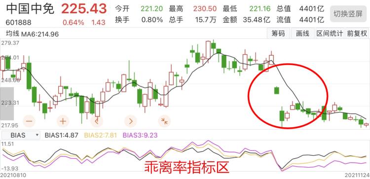 然后再看第二张图:股价短期内出现大跌,k线跑到了均价线的下方,所以乖离率一定是负数,因为股价大跌,所以k线和均线向下分离的距离变大,这时候乖离率的数值也会越来越小。