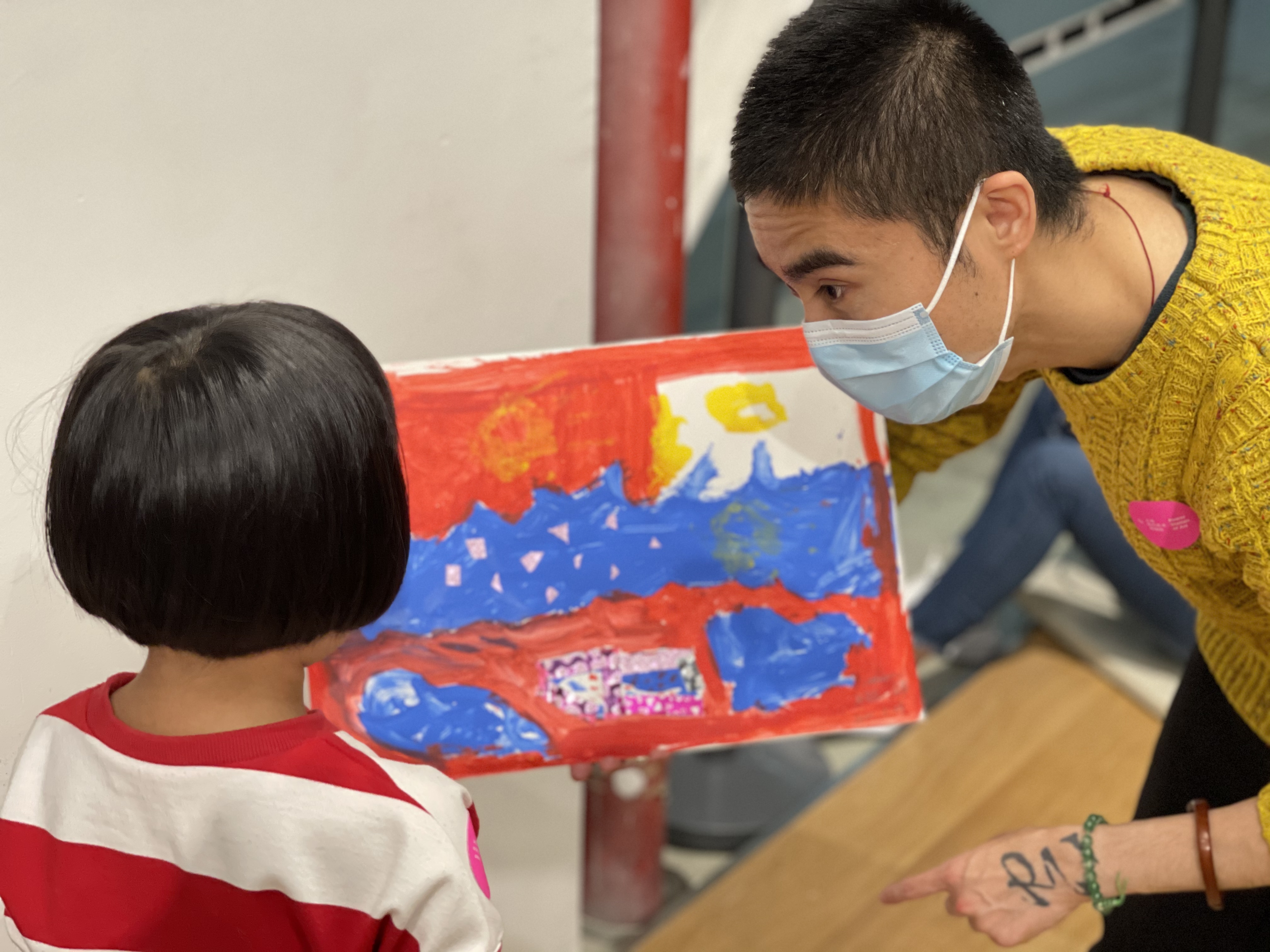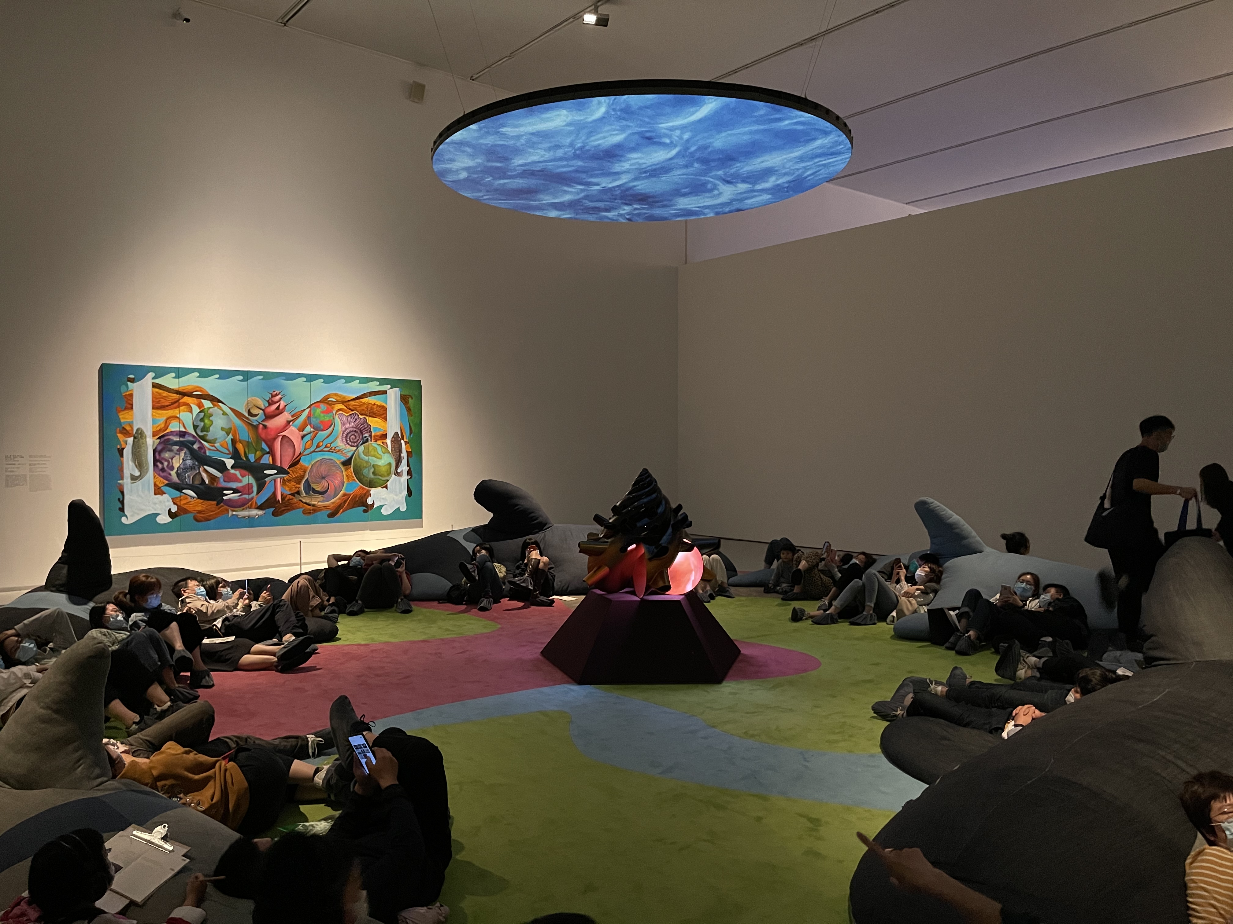 今天最快乐的事就是去了当代艺术博物馆看了“水体”展览,然后在老师的带领和启发下画了个海洋的故事。这是第13届上海双年展@儿童工作坊举办的其中的一个活动,朋友给她女儿预约然后因为太忙让给了我们。咩在参与的小朋友中属于低幼龄,对于艺术的感知尚且在懵懂阶段。老师一边在说,她一边奋笔疾画,不停笔记作画——是真的真的很爱画画了。其中最爱的一个作品,是虎鲸大靠枕的一个装置艺术,地面上躺着好几条“虎鲸大靠垫”,我们躺在“虎鲸”身上,仰望上方的液晶显示屏,好舒服呀!
