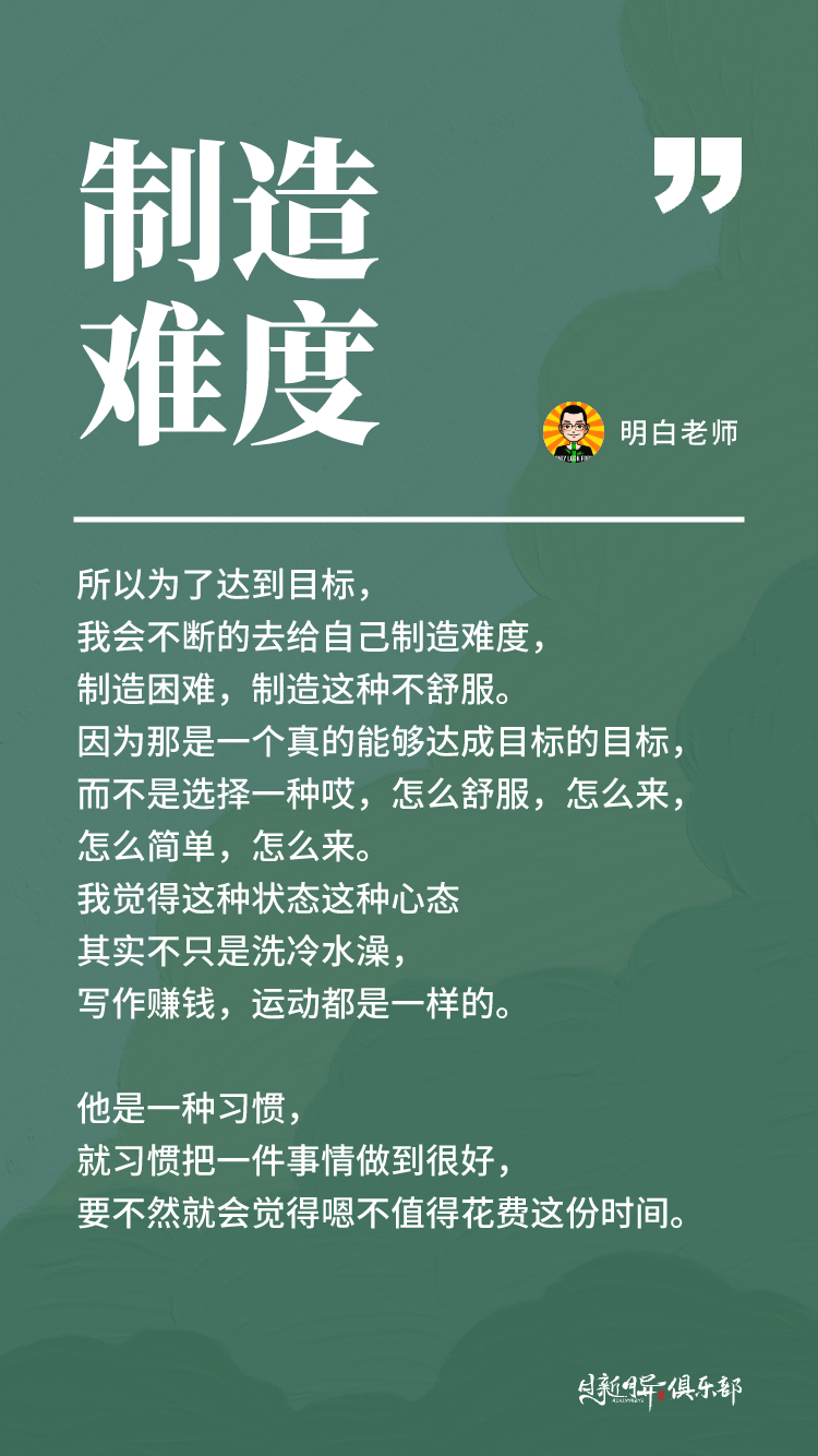 所以为了达到目标,我会不断的去给自己制造难度,制造困难,制造这种不舒服。因为那是一个真的能够达成目标的目标,而不是选择一种哎,怎么舒服,怎么来,怎么简单,怎么来。我觉得这种状态这种心态其实不只是洗冷水澡,写作赚钱,运动都是一样的。