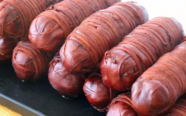 湖南捆鸡,这款分荤素两种的小吃,是长沙美食文化中的一朵奇葩。肉捆鸡是用鸡肠、鸭肠、猪小肠等捆卷成火腿状,在特制卤水中卤煮而成。每一口咬下去,都能感受到浓郁的卤香味和独特的口感。