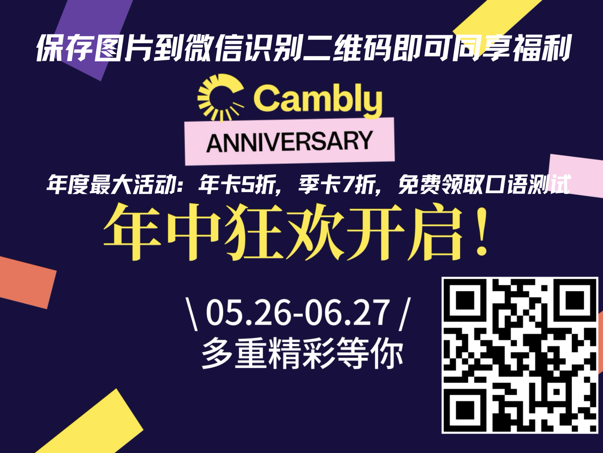 节目中提到的真人外教平台Cambly,5.26-6.27是「年度最大活动」——咱听友可享年卡5折,新用户8块钱试听30分钟,买年套餐还额外加赠正价课时!