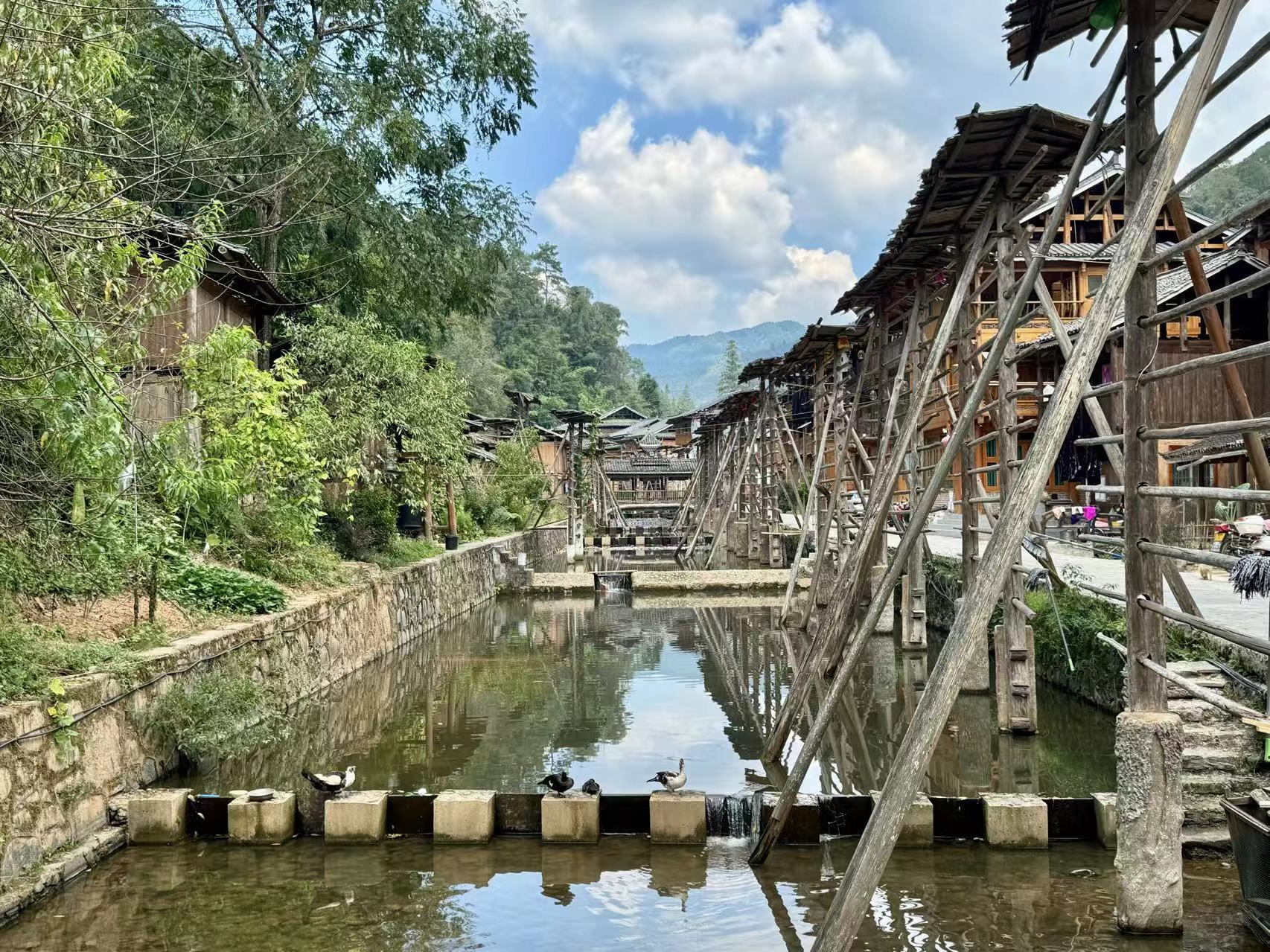 占里侗寨小河边整齐排列的晾禾架,也许再过几日就将晒满金黄》》》》