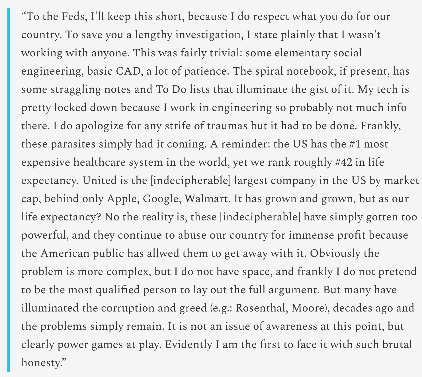 本期将为大家带来一起近期发生在美国的案件,相信大家看到了标题就能猜到个七七八八了。这个案件的热度非常的高,犯罪嫌疑人Luigi在上个月已经接受了一次法庭审理,将在2025年2月21号(也就是下个月)接受第二次审判。本期播客会介绍Luigi的成长背景和他的犯案动机,尝试解答他为何会策划这样一起轰动全美(甚至是全球)的案件。