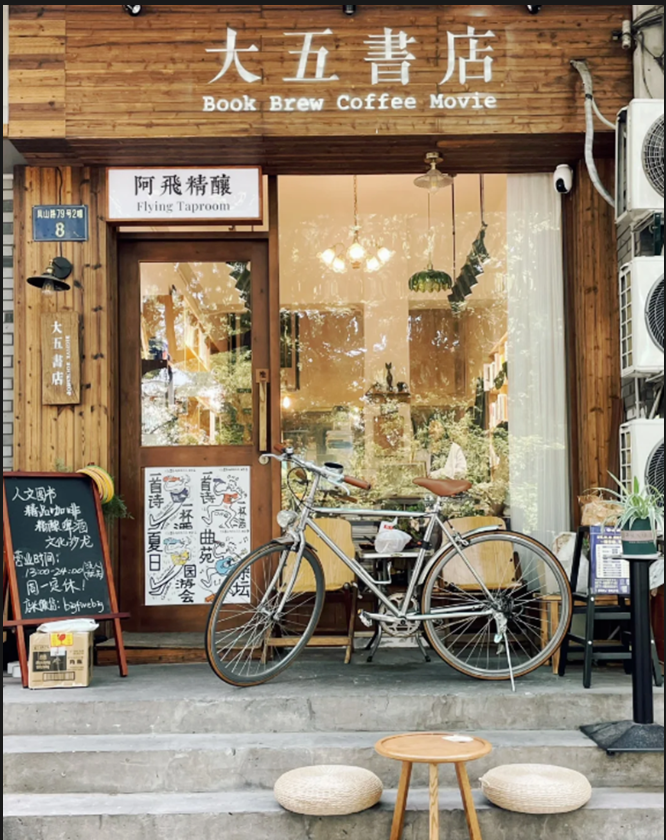 总之,大五书店就是一家主营人文类新书、绝版旧书,兼营精品咖啡、精酿啤酒以及古着服饰,经常做电影沙龙等文化活动的很有特色的独立书店。