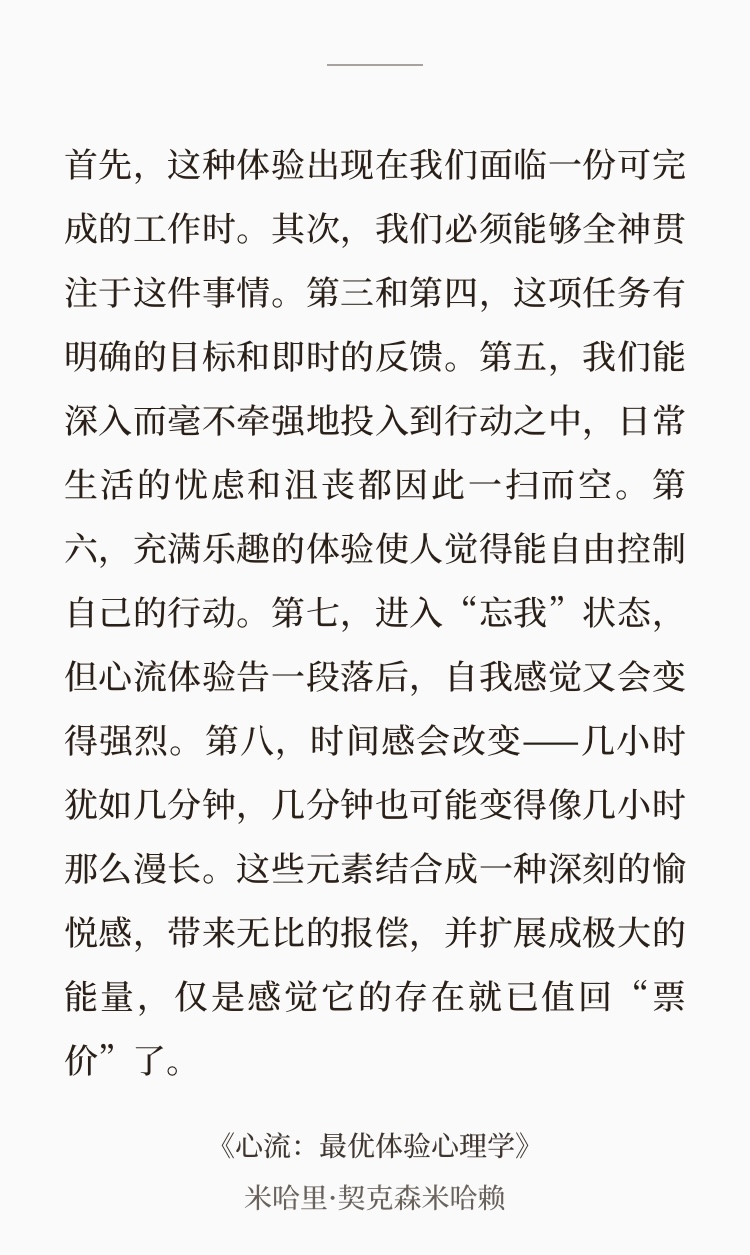 如果一个人能随心所欲地进入心流,不受外在条件限制,就已掌握了改变生活品质的钥匙。