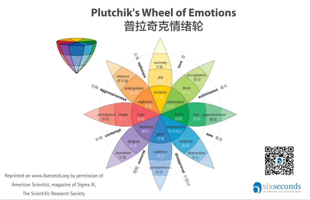 看完电影后,我问了一圈身边的人,你的情绪主控台是谁在操控啊?得到的答案不尽相同,有joy,有丧丧,有忧忧,还有四手联弹的。但你看这正是皮克斯了不起的地方,那么抽象的问题,看完电影后我们有个具象的谈资可以切入开始聊了,而他们只花了97分钟的时间,就把心理学家的旷日持久的研究通俗易懂地讲清楚了。以下是心理学家Robert Plutchik通过大量的研究后,构建了普拉奇克情绪轮模型(又称情绪花瓣)。