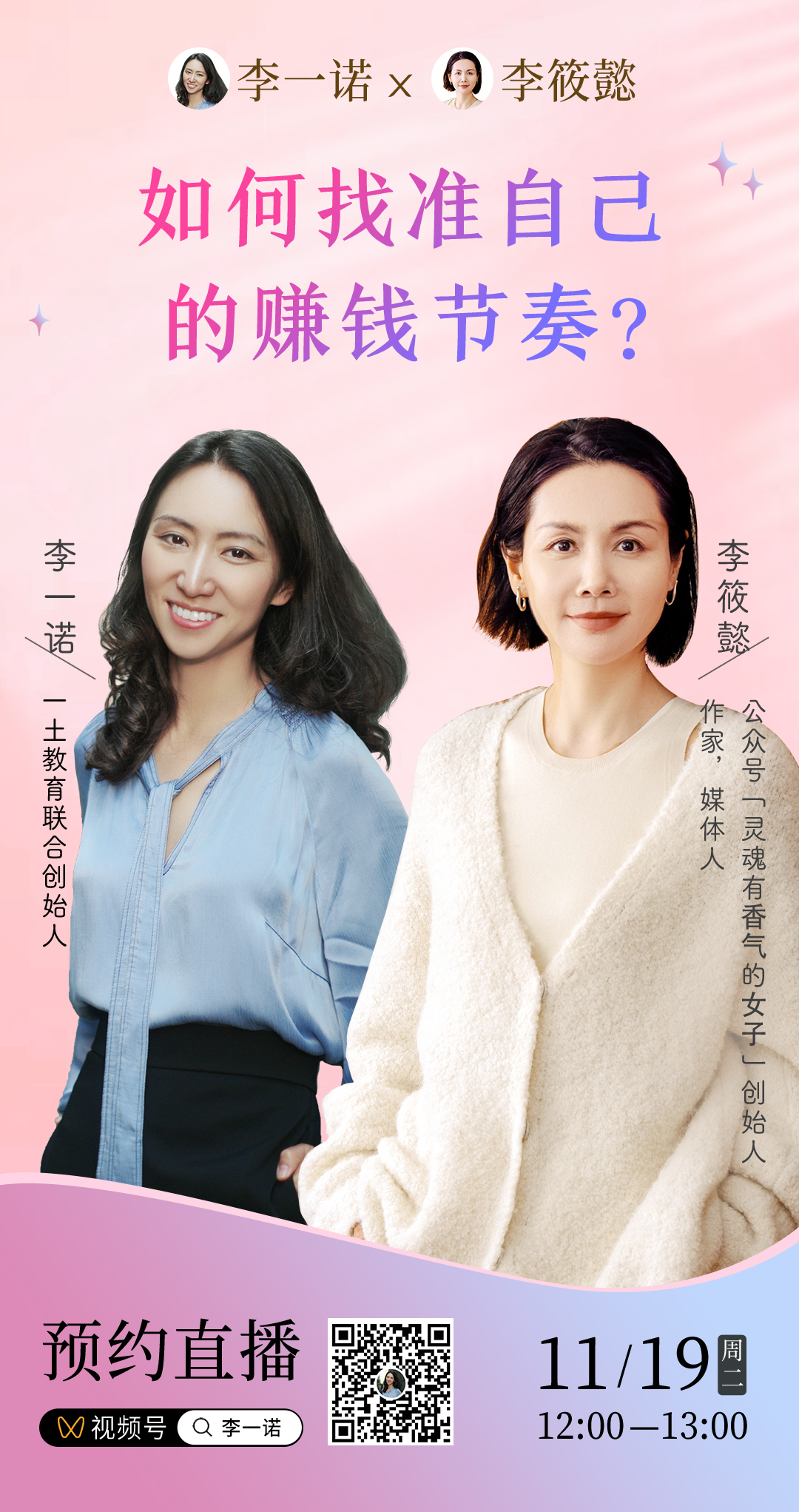 如果你想第一时间听到我的访谈,欢迎关注我的视频号@李一诺Y.L,我会不定期跟国内外的专家学者作者等进行直播对谈,11月19日(下周二)中午12点,我将会和李筱懿连麦,一起聊聊“钱”的话题——如何找准⾃⼰的赚钱节奏?欢迎扫码预约直播~