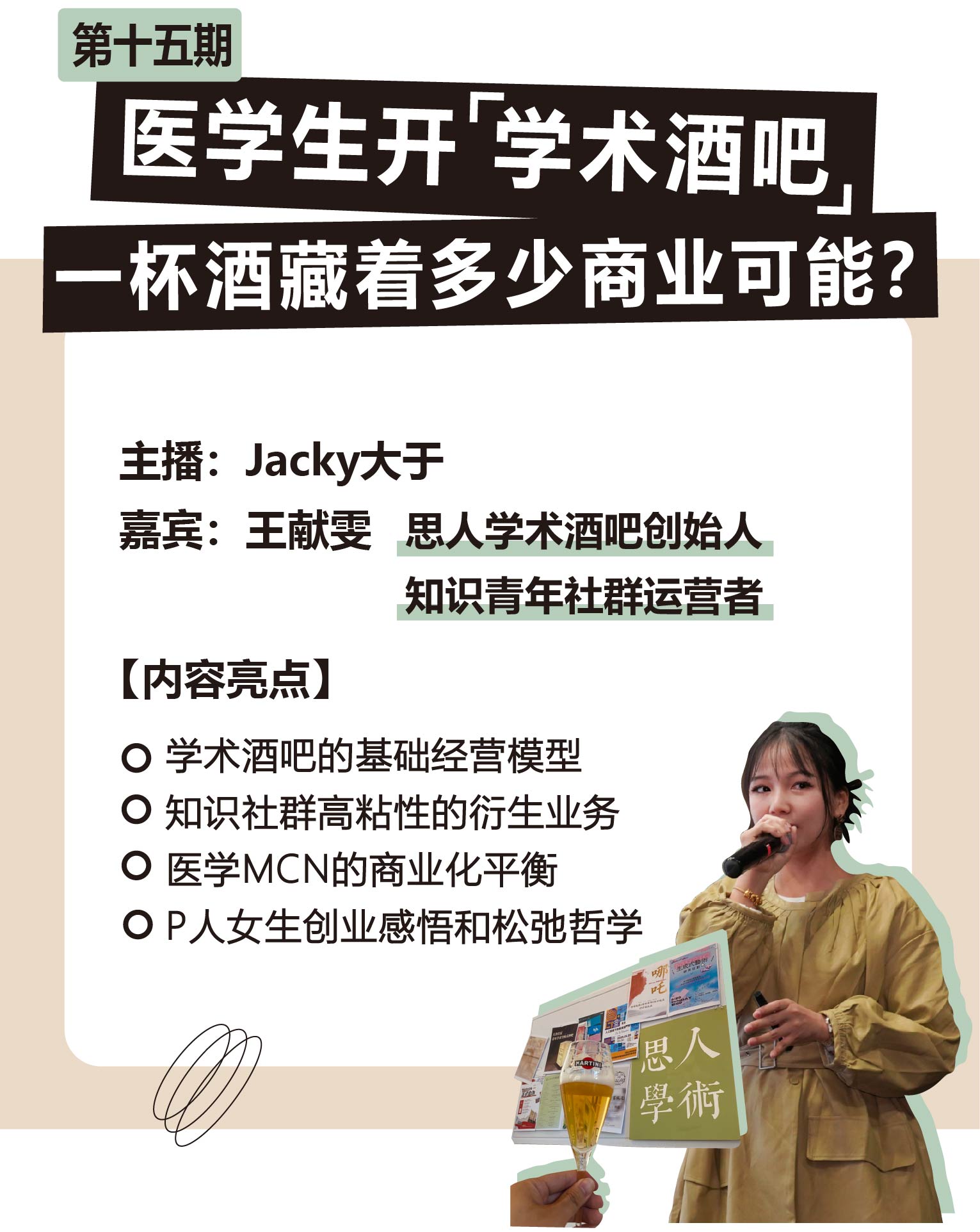 我请到了一位非常厉害的嘉宾,她医学研究生毕业后到三甲医院实习,gap1年后开始学术酒吧创业—,思人学术酒吧的主理人王献雯,来分享这个话题。