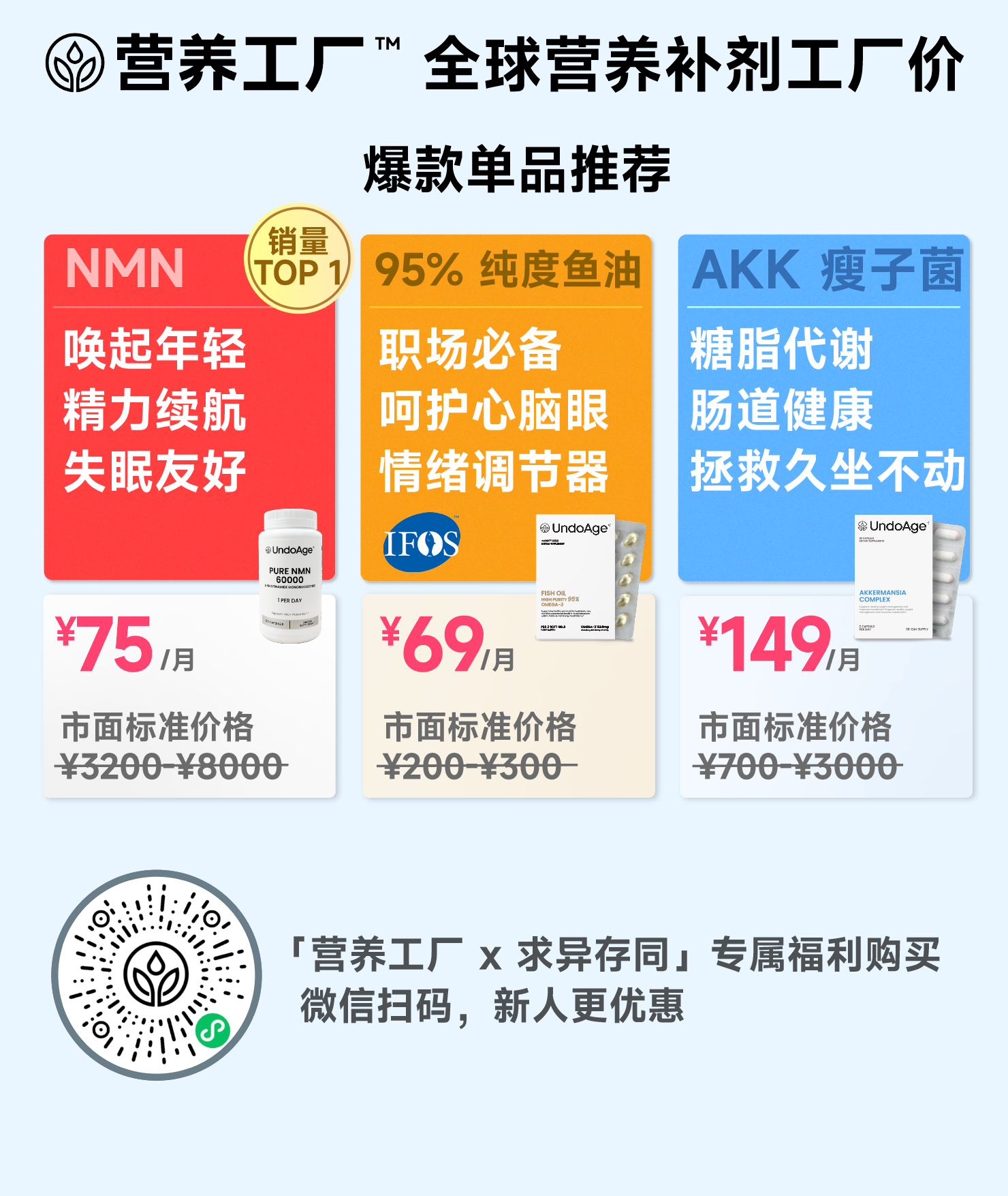 ● 过了 25 岁、低能量、易疲惫——首推稳居营养工厂「销冠」的 NMN,提高 NAD+,从细胞根源延缓衰老,充沛精力,对提高睡眠质量、改善发肤甲尤其明显