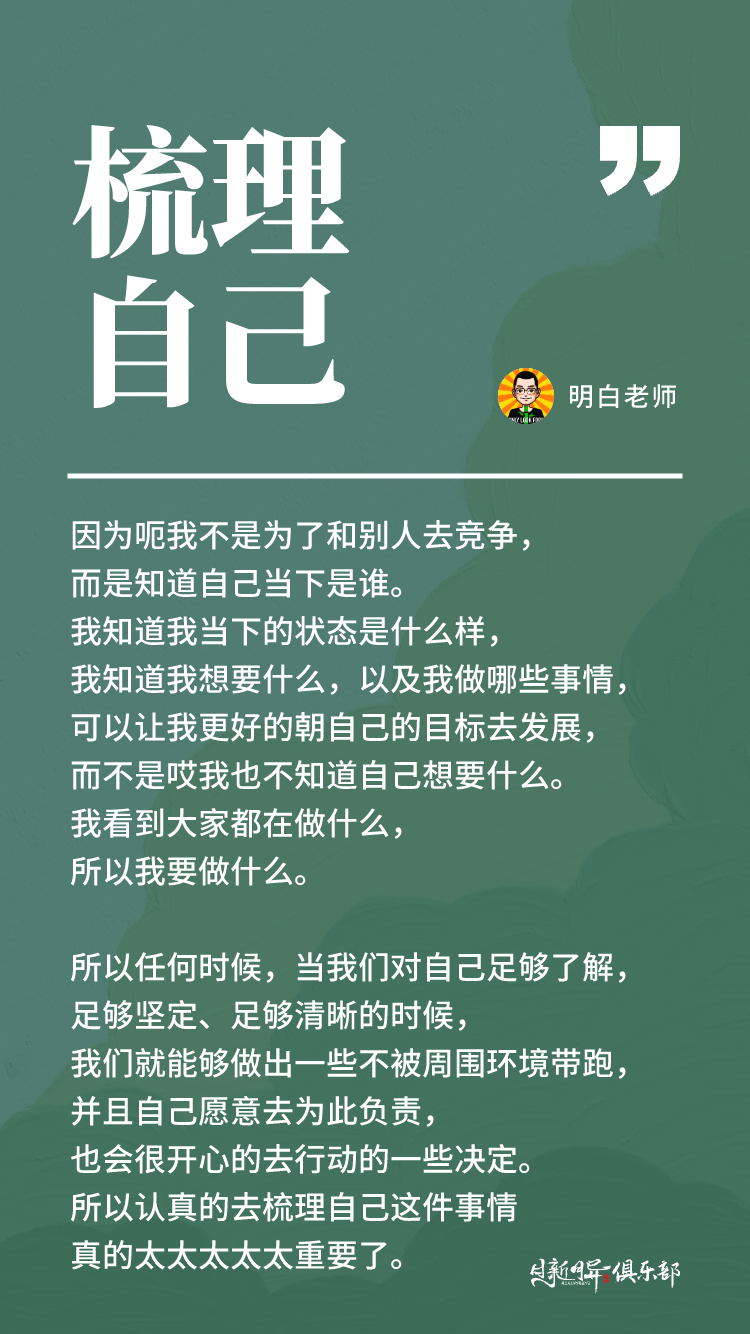 所以任何时候,当我们对自己足够了解,足够坚定、足够清晰的时候,我们就能够做出一些不被周围环境带跑,并且自己愿意去为此负责,也会很开心的去行动的一些决定。所以认真的去梳理自己这件事情真的太太太太太重要了。