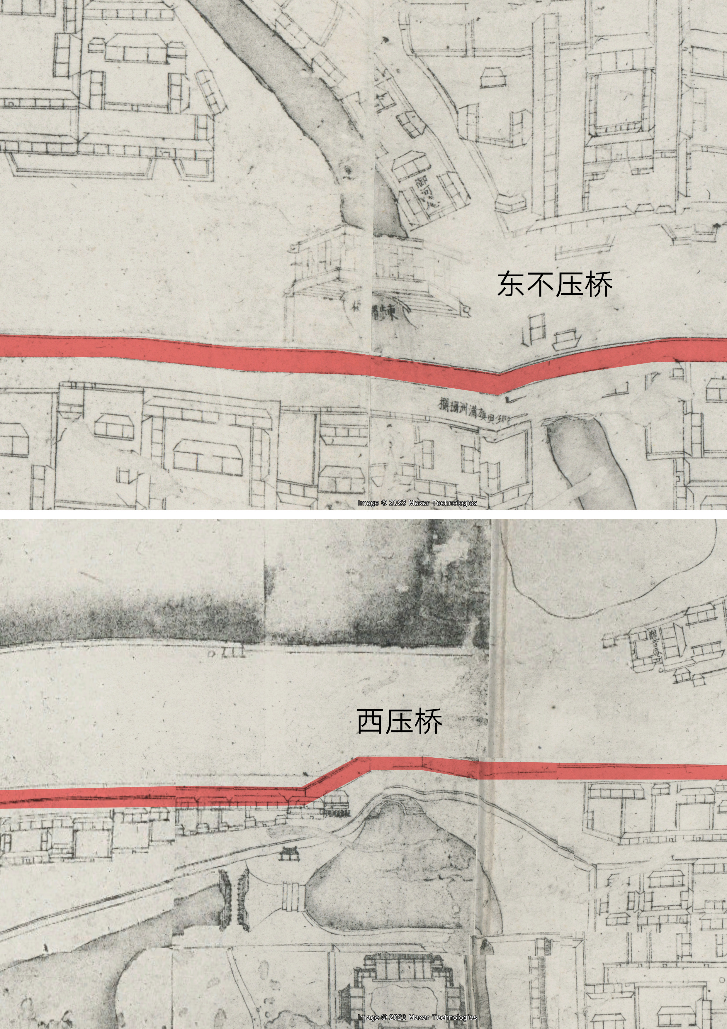 乾隆京城全图里的东不压桥与西压桥(标红部分为皇城墙):