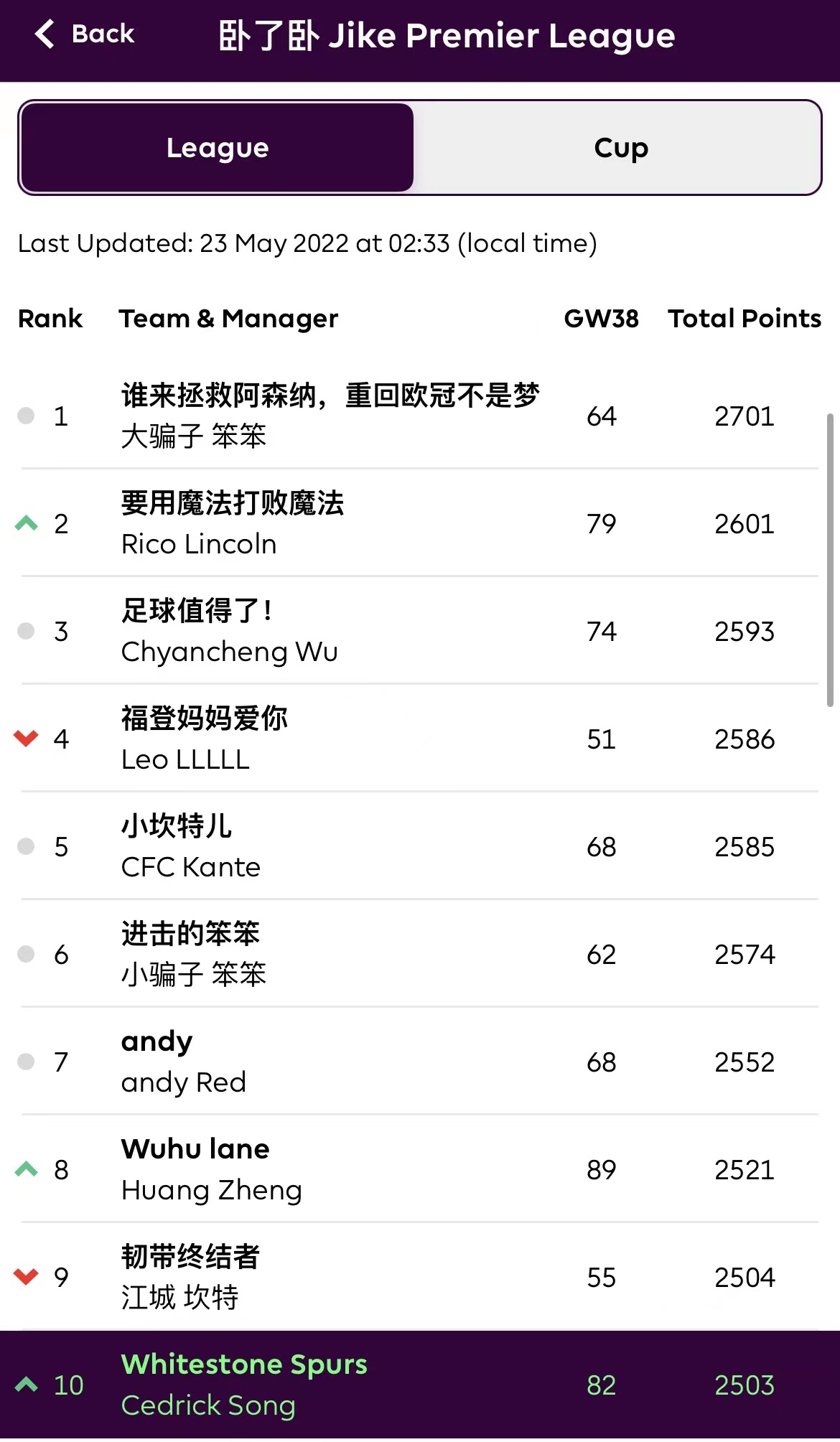 02:15:23 个人FPL时刻那就必须是,顺着宋指的中国杯经历说下去了,因为我就是宋指艰难挺过的12轮中的一位对手。我既是即超的经理人,同时也是看球者说的老听友,所以杯赛对阵宋指的那一轮选人格外的认真和严谨,既要出其不意,也要保证稳定得分。出于我们两人前一轮的阵容太过趋同,所以也惊叹于宋指导理查利森的diff选择。事后来看,可谓妙手