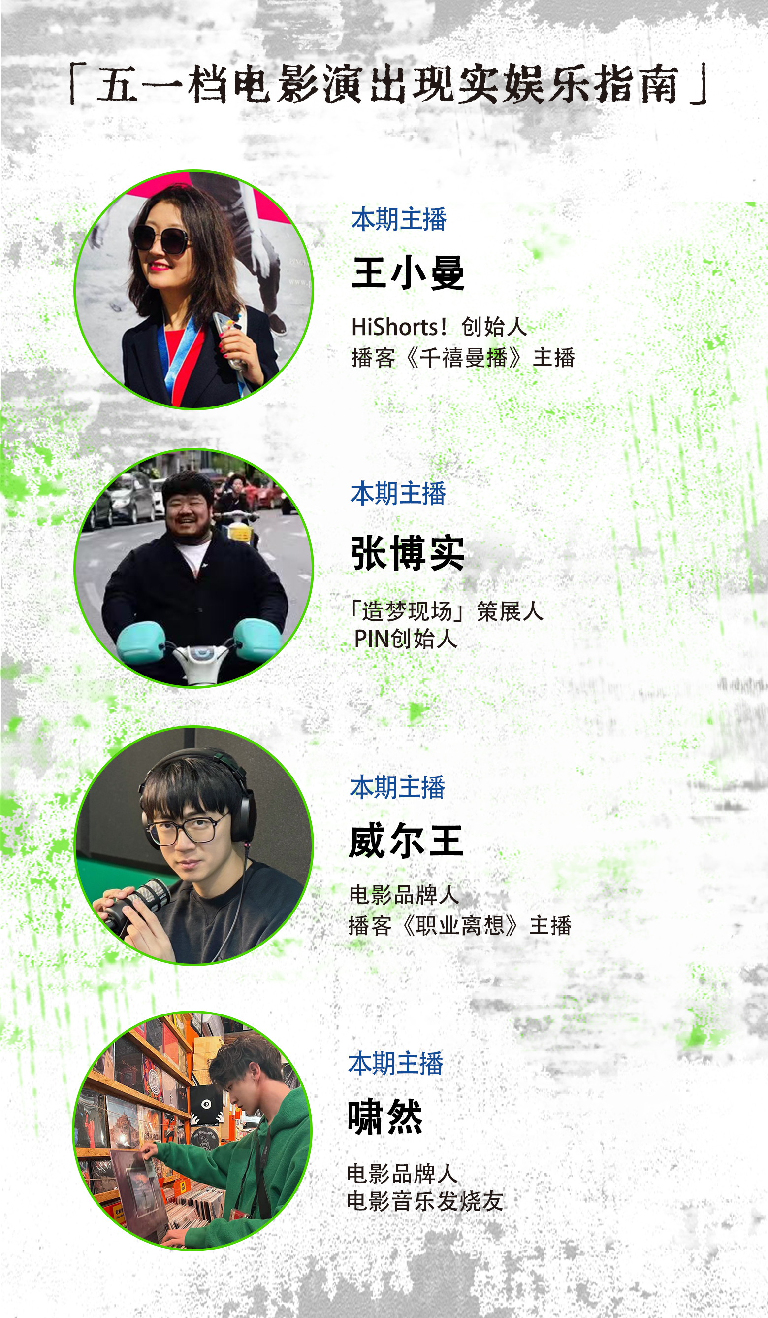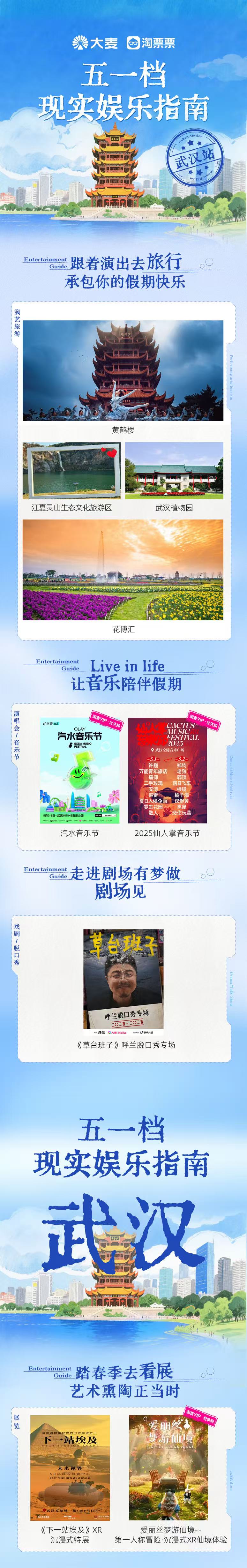 本期节目划到就是赚到了!四位常驻主播首次集结,一起盘点五一档覆盖全国多个重点城市的30多个电影、演唱会、展览等精彩演出活动,共同分享我们关于城市攻略、影迷情怀、演出体验的一手经验。