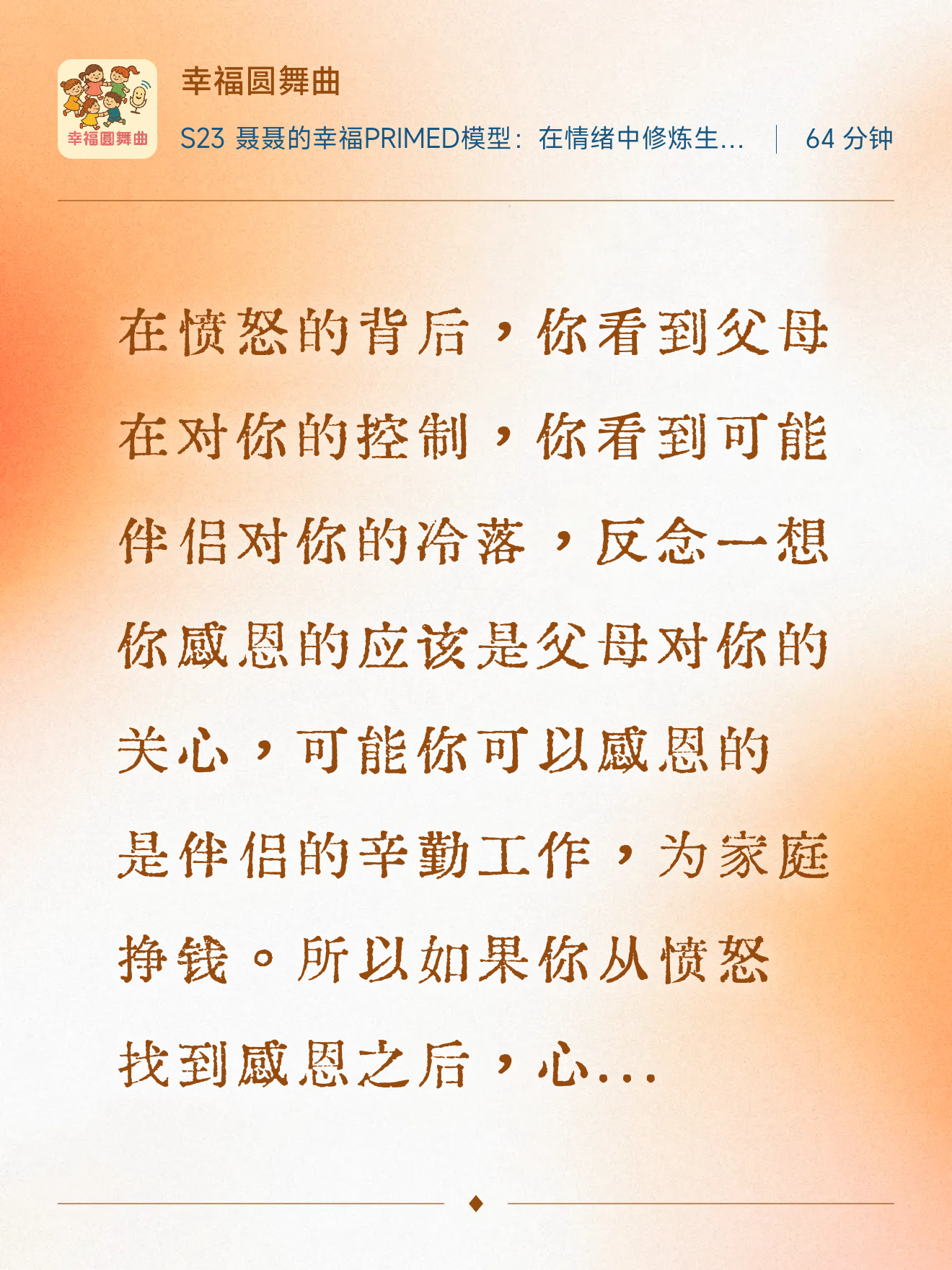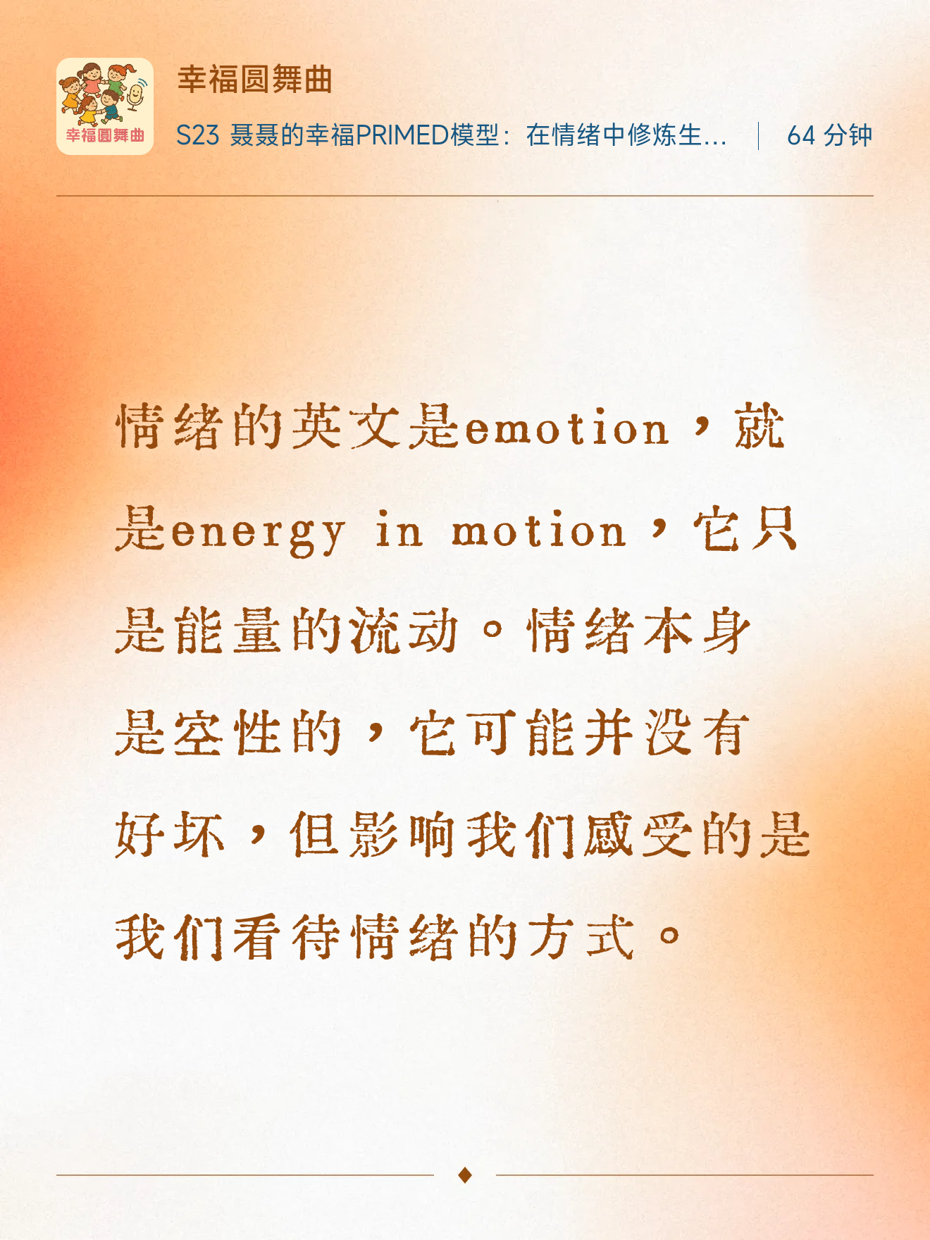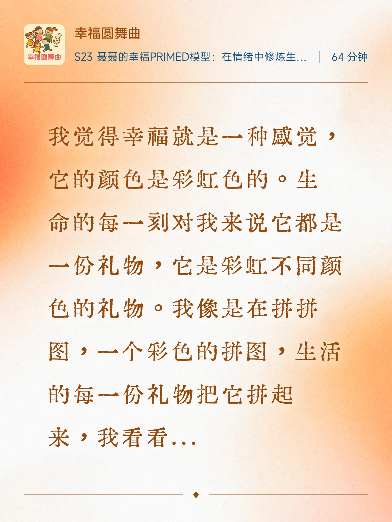 在本次深入探讨中,生命力教练聂聂与幸福圆舞曲播客团队成员就情绪管理、幸福感和个人成长进行了交流。聂聂强调情绪作为内在力量的体现,提出了情绪作为礼物的概念,倡导通过觉察和接纳情绪来提升个人幸福感。她分享了五步骤情绪管理方法和SAFER模型,教导如何在情绪波动时保持冷静,实现情绪的有效转化。此外,聂聂介绍了她的PRIMED模型,即目标感、资源、意图聚焦、正念觉察、积极情绪和发展自信,作为提升幸福感和生命质量的六大支柱。参与者还讨论了面对困境的策略,包括与身体的连接、寻求专业支持和培养慷慨之心。个人幸福的来源如家庭时光、自然之美、阅读和创造性工作也被分享。最后,聂聂推荐了《当下的力量》一书和歌曲,鼓励听众培养当下意识和感恩心态,以提升个人幸福感和生命质量。整个对话充满智慧和实用建议,旨在帮助听众更好地理解和管理情绪,追求个人成长和幸福生活。