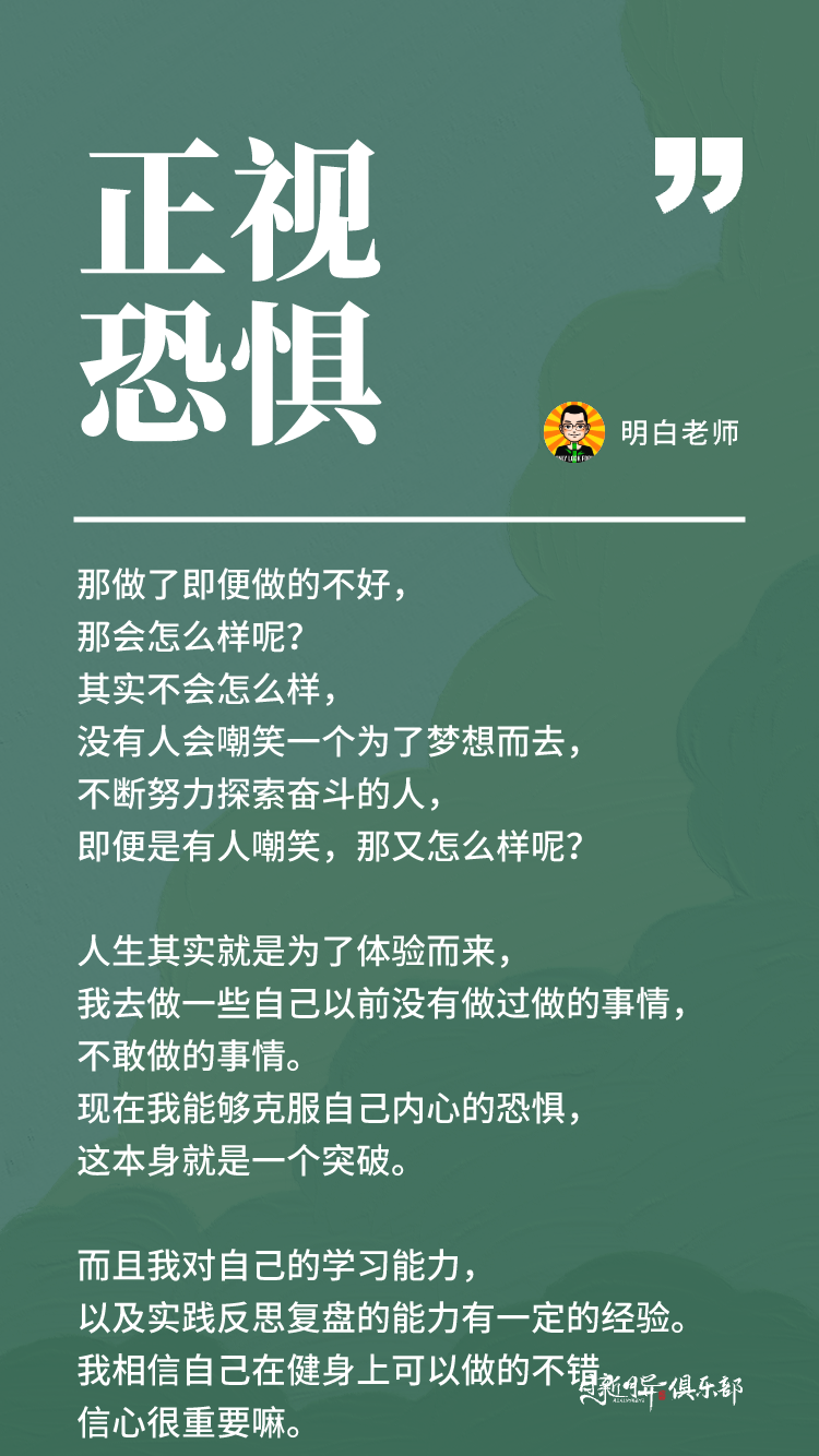 而且我对自己的学习能力,以及实践反思复盘的能力有一定的经验。我相信自己在健身上可以做的不错,信心很重要嘛。我要先对自己有百分之一百二十的信心,要不然那件事肯定做不成,所以不要恐惧,不要害怕,害怕没什么用,那就不要害怕。