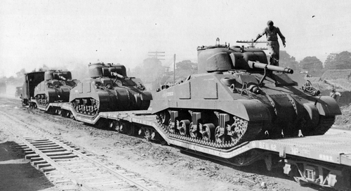 英军正在印度境内通过铁路押运敷设了附加装甲的谢尔曼V型坦克(M4A4)