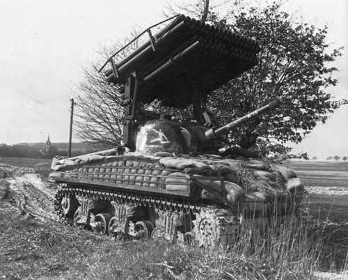 美陆军第十四装甲师第四十八坦克营A连的M4混合车体型“安娜贝尔”号正在驶向炮击位置,其炮塔上装有114毫米火箭串联发射装置。该坦克在车体侧部焊有工字钢,堆放沙袋以增强防护力,车体首上装甲也堆放了沙袋