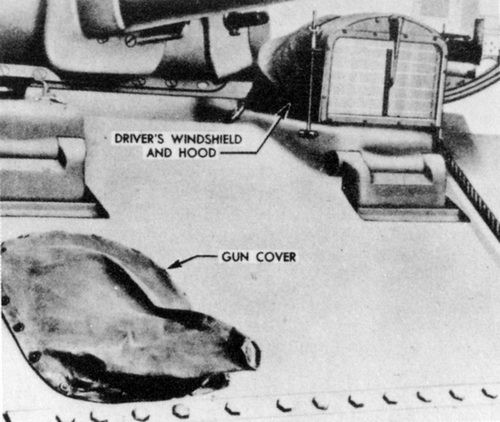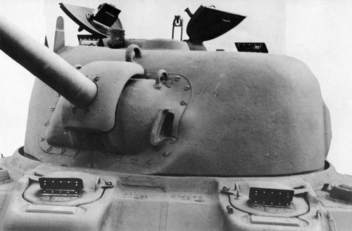一辆早期型的谢尔曼坦克,已经用正副驾驶员出檐顶部的辅助潜望镜取代了原本的展望口,这两具辅助潜望镜的顶盖就位于正副驾驶员舱门的正前方。但是和舱门上潜望镜不同的是,辅助潜望镜不能转动