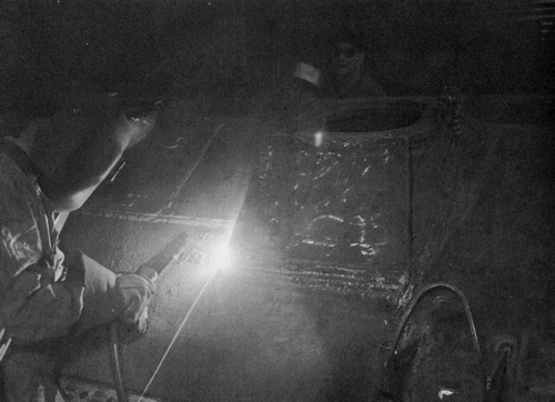 在底特律兵工厂的克莱斯勒生产线上,工人们正在为M4A4坦克驾驶员出檐正面焊接附加装甲