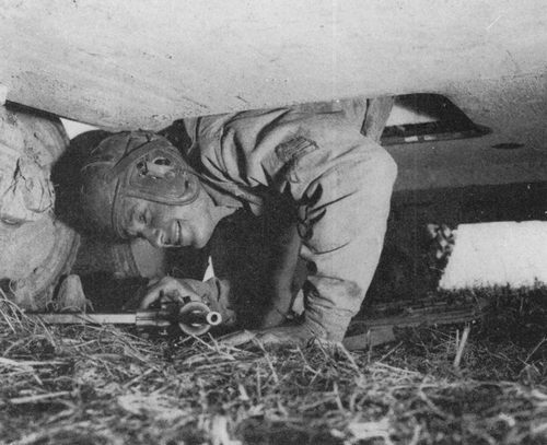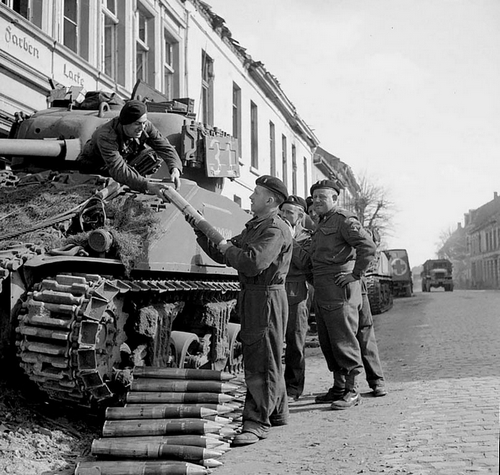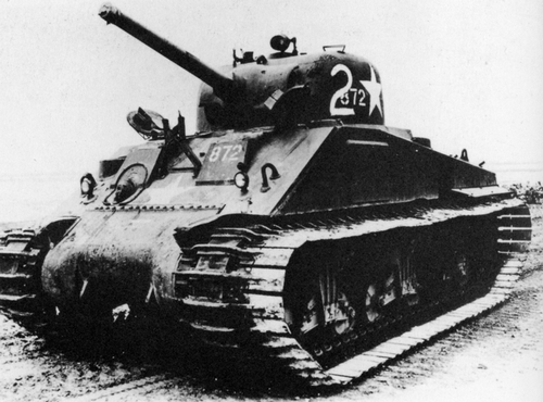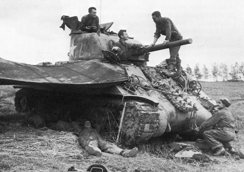 1944年9月26日入夜前,美陆军第四装甲师第三十七坦克营的邓恩中士和他的车组乘员正准备在自己的M4坦克旁宿营,其车体首上装甲挂有备用履带以增强防护力。他们此时正在沙托萨兰地区附近与轴心军作战