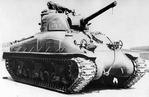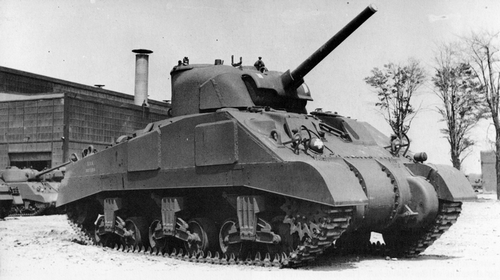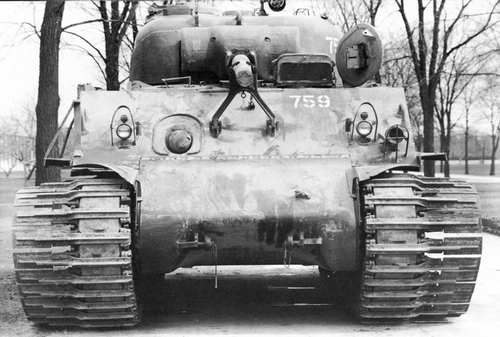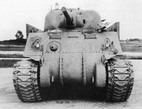 晚期型的M4A4坦克在底特律兵工厂外等待装运,车体和炮塔上已经加装了附加装甲。注意即便是晚期生产的M4A4也仍旧使用三片式的主变速机外罩