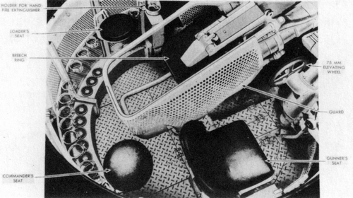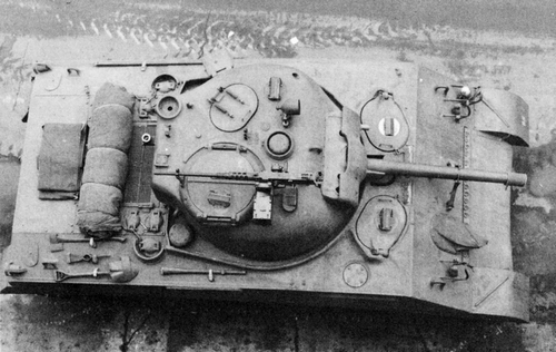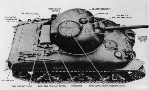 早期型M4A1坦克顶视指示图,该车已经取消了车体前部固定机枪并采用炮手潜望镜,引擎舱进气口上和M3系列以及T6一样装有钢制护盖