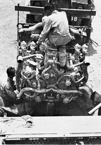 英军机械师正在维护谢尔曼V(M4A4)的A57型引擎组,它在吊出引擎舱后已经被旋转了180度,可以看到庞大机组的5套化油器