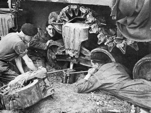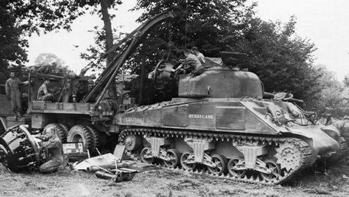 英军士兵正在为一辆谢尔曼V(M4A4)更换受损的重载轮轴架