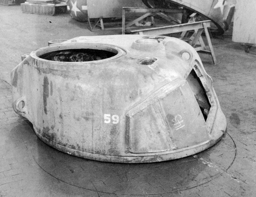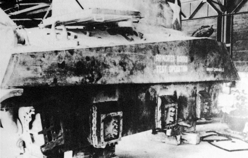 在底特律兵工厂的克莱斯勒生产线上,工人们已为早期谢尔曼坦克相对薄弱的炮塔右前部焊上了附加装甲,为炮手提供更好的防护